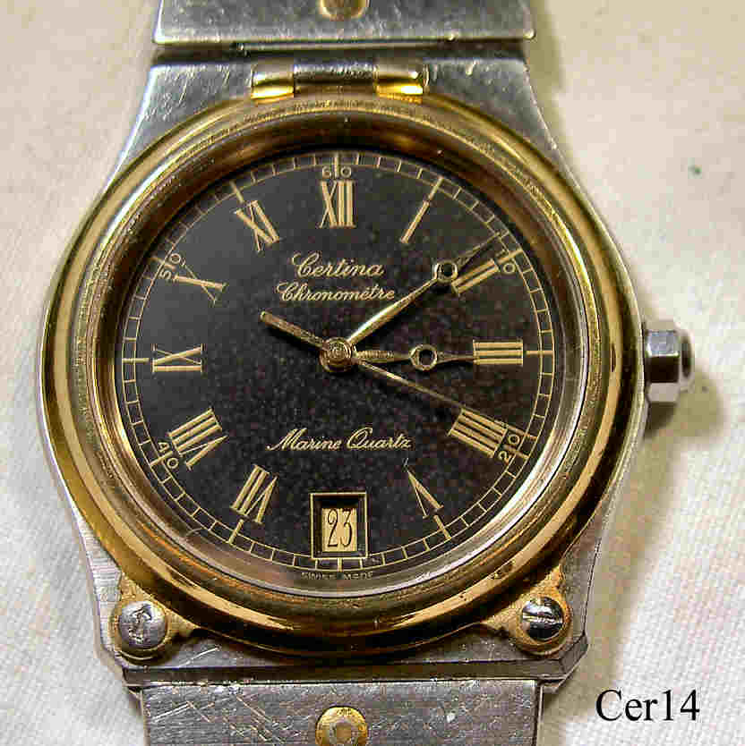 Dies ist eine Certina Newport Quartz Uhr im Nautic Design mit verschraubter Krone, beschriftet: ”Certina, Chronomètre, Marine Quartz, Swiss Made”, innen: ”Seven Jewels, unadjusted, Swiss, V8”, hinten: ”744 3010 40, Water Resistant 10 ATM, Newport”. Gehäuse Edelstahl, geschraubter Boden, Kaliber ESA 954.111.