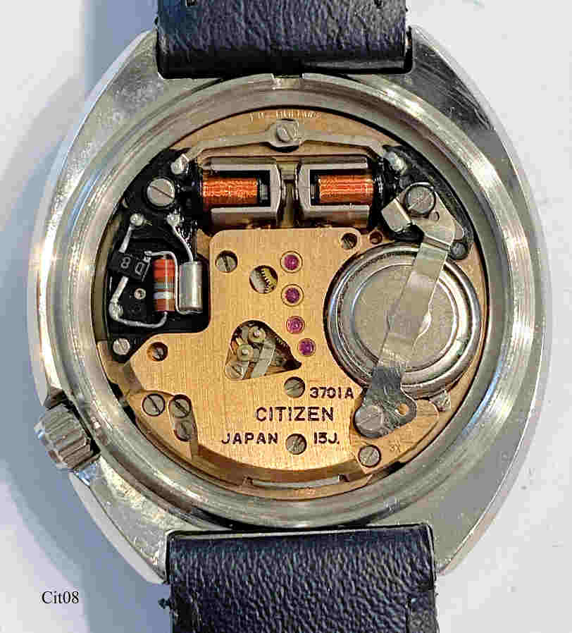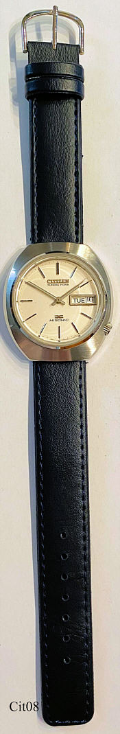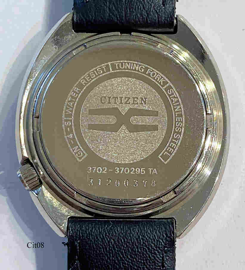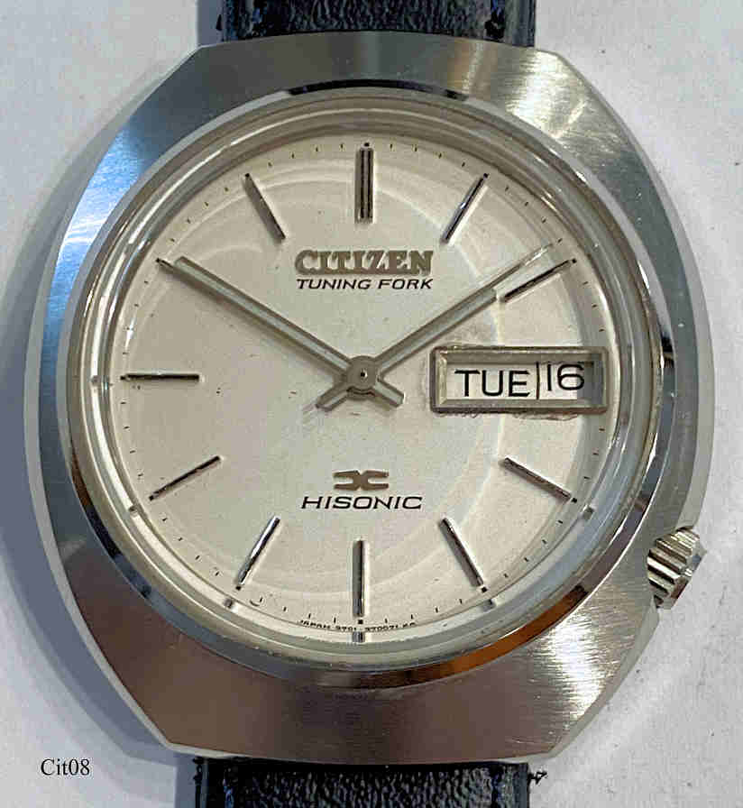 Dies ist eine Citizen Hisonic, neben der Accutron und der Unisonic von Universal Genève die einzige Stimmgabeluhr mit dem Bulova 2182 Werk. Werk N° 41003588, Citizen Caliber 3701A, Referenz Nr.: 3702-370295 TA, Beschriftet vorn: ”CITIZEN, Tuning Fork, Hisonic, Japan 3702-370295”, Rückseite: ”GN-4-S,Water Resist, Tuning Fork, Stainless Steel, Citizen, 3702-370295 TA, 31200378”, innen: “3701A, Citizen, Japan, 15J”, Edelstahl Gehäuse, Day/Date bei der 3. Citizen stellte die Bulova Stimmgabelwerke für den Fern Ost Markt für Bulova her.
