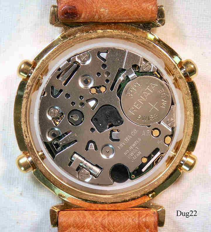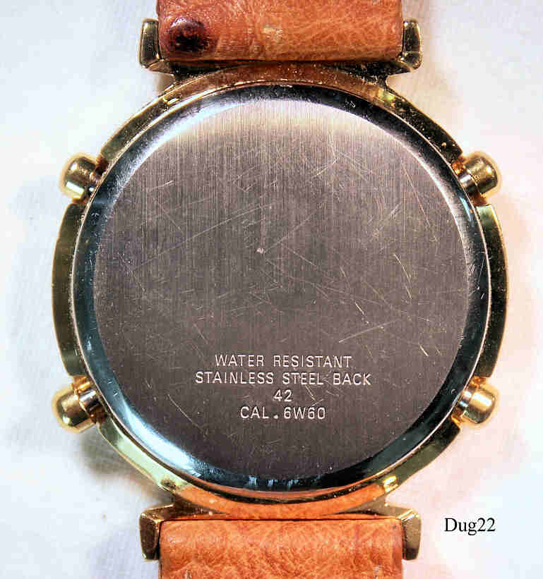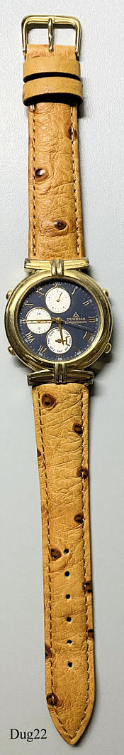Ein Dugena Chronograph mit vergoldetem Gehäuse und Stainless Steel Back. Kaliber Miyota 6W60, Beschriftung vorn: “Dugena, Chronograph”, hinten: ”Water Resistant, Stainless Steel Back, 42, CAL. 6W60”, innen: “Miyota Co. No Jewels, 6W60, Japan”. Braunes Straußenleder Armband. Sehr schön ausgearbeitete verdeckte Bandanstöße