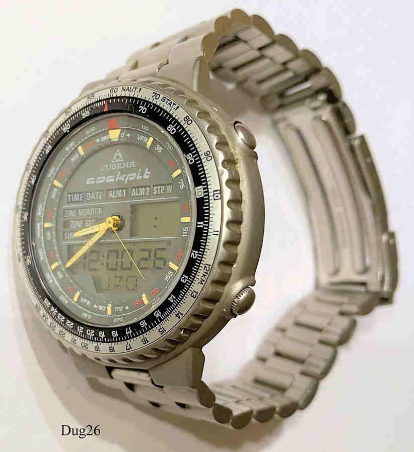 Ein Dugena Chronograph mit Edelstahl Gehäuse und Stainless Steel Back. Kaliber Miyota 281-44, Beschriftung vorn: “Dugena, Cockpit, Funktionsbezeichnungen” hinten: ”Dugena, Cockpit, Reg. Wz. 1010947, Stainless Steel, Quartz, Water Resistant, 100M, 844470-42-CL81”, innen: “Miyota Co., No (0) Jewels, Japan, 281 44”. Dugena Edelstahl Armband mit Dugena Schließe.