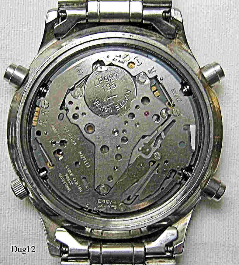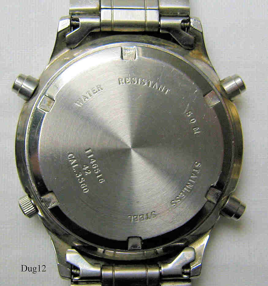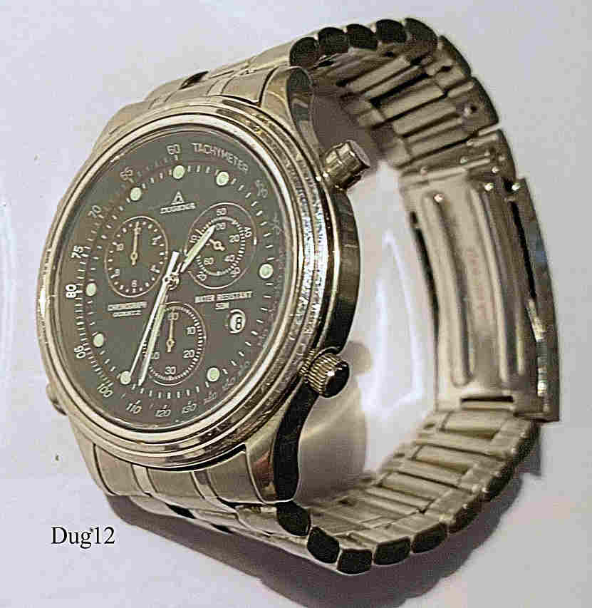 Ein Dugena Chronograph mit Edelstahl Gehäuse und Edelstahl Boden. Kaliber Miyota 3S60, Datum bei der 4, Beschriftung vorn: “Dugena, Chronograph, Quartz, Water resistant 50M”, hinten: “Water Resistant, 50 Ft., Stainless Steel, 1148616, 42, Cal. 3S60”, innen: “Unadjusted, 3S60A, Twelve 12 Jewels, Citizen Watch Co., Japan”. Dugena Edelstahl Armband mit Dugena Schließe.