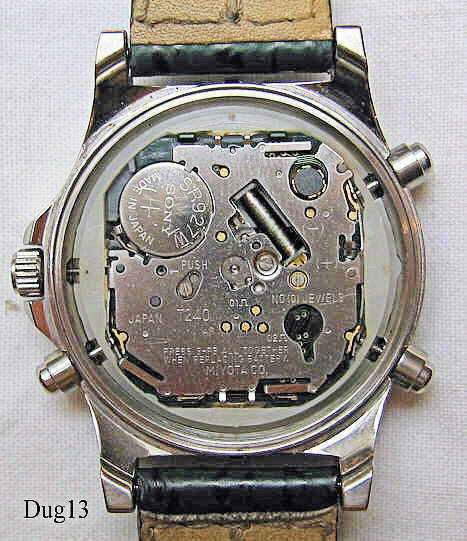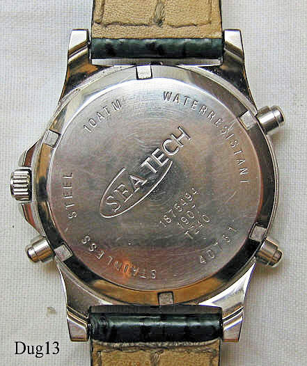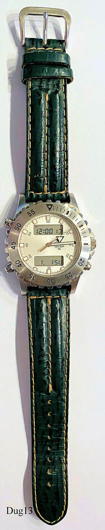 A Dugena Chronograph “Sea Tech” with Stainless Steel case and Back. Caliber Miyota T240, second time zone and date as LCD window at 12 and 6. Signed front “ Dugena Sea  Tech,100” back:” Stainless Steel, 10 ATM, Water Resistant, 40751,Sea Tech, 1875494, 1907, T240”,  inside: “No (0) Jewels, Japan, T240, Miyota Co.”. Green leather strap with Dugena clasp.