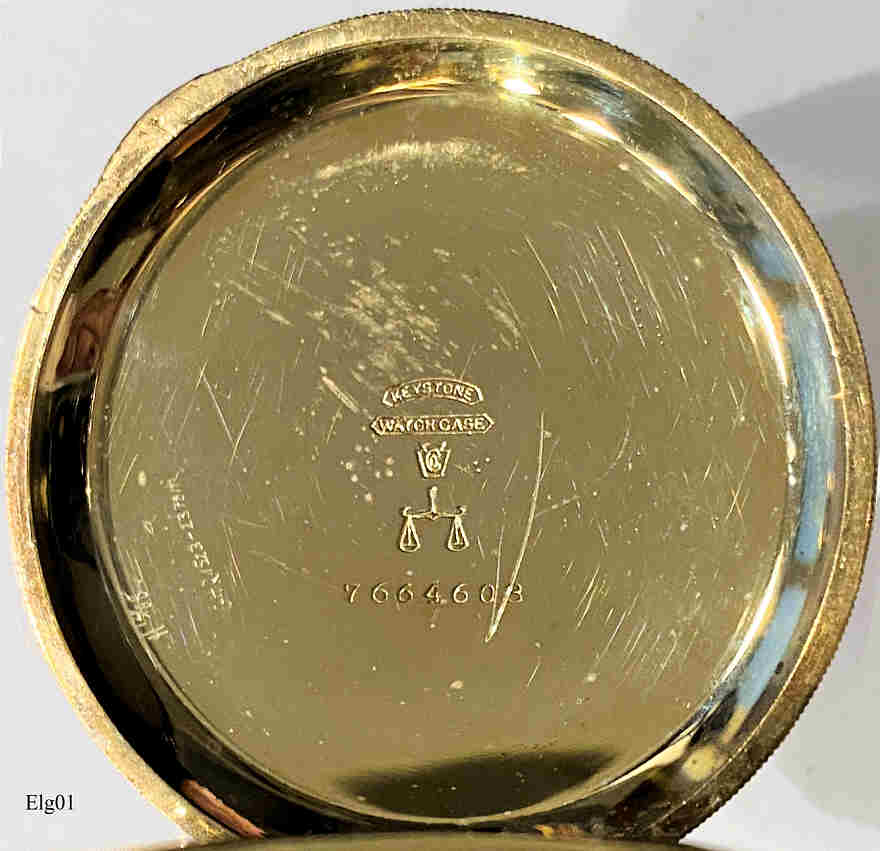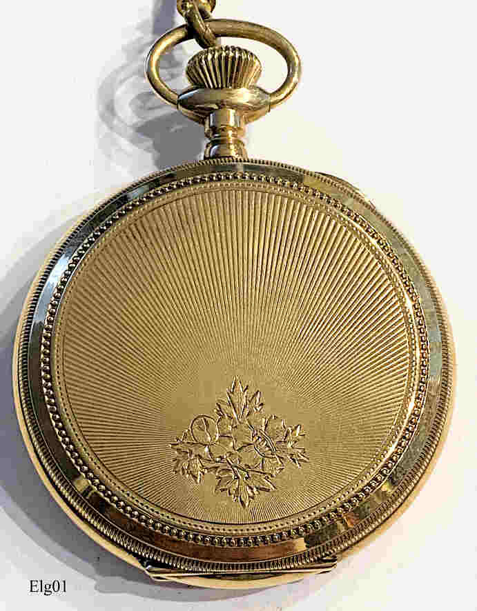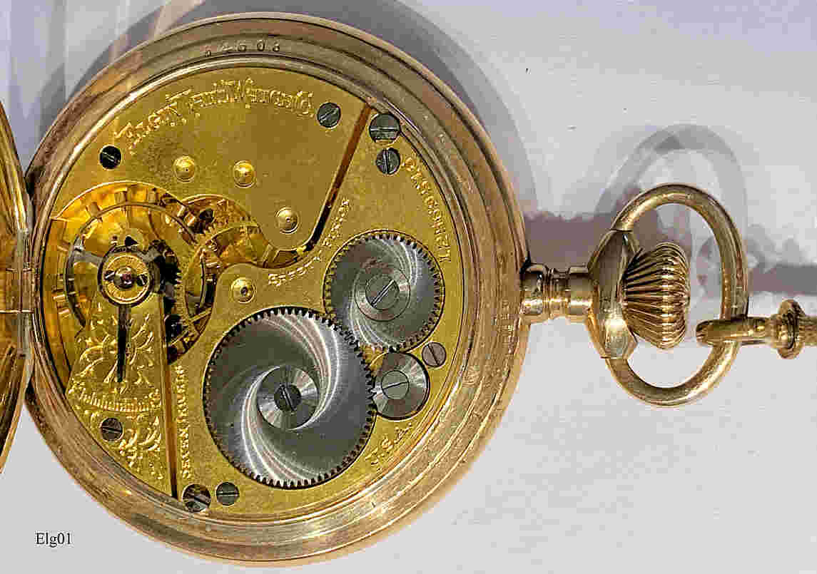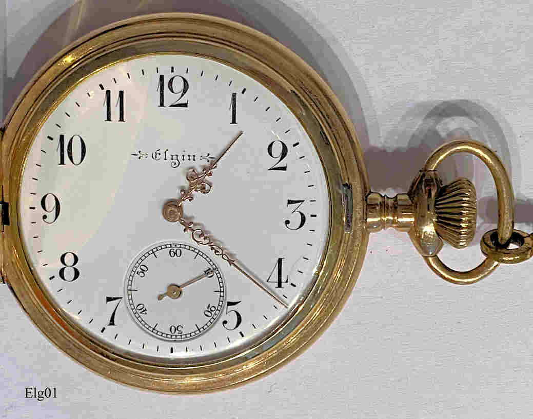 Eine Elgin Taschenuhr mit vergoldetem Gehäuse und dazu passender Uhrenkette. Dies war die “gute” Uhr meines Großvaters, der sie während seiner Fahrenszeit von Amerika mitgebracht hatte. Beschriftet vorn: “Elgin”, innen: “Elgin Nat’l. Watch Co., 12569516, Seven Jewels, Safety Pinion, USA”, im Deckel innen: ”7664608”. Es handelt sich hier um ein Model 6, Grade 151, Herstellung ca. 1898