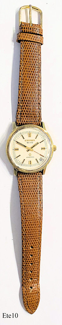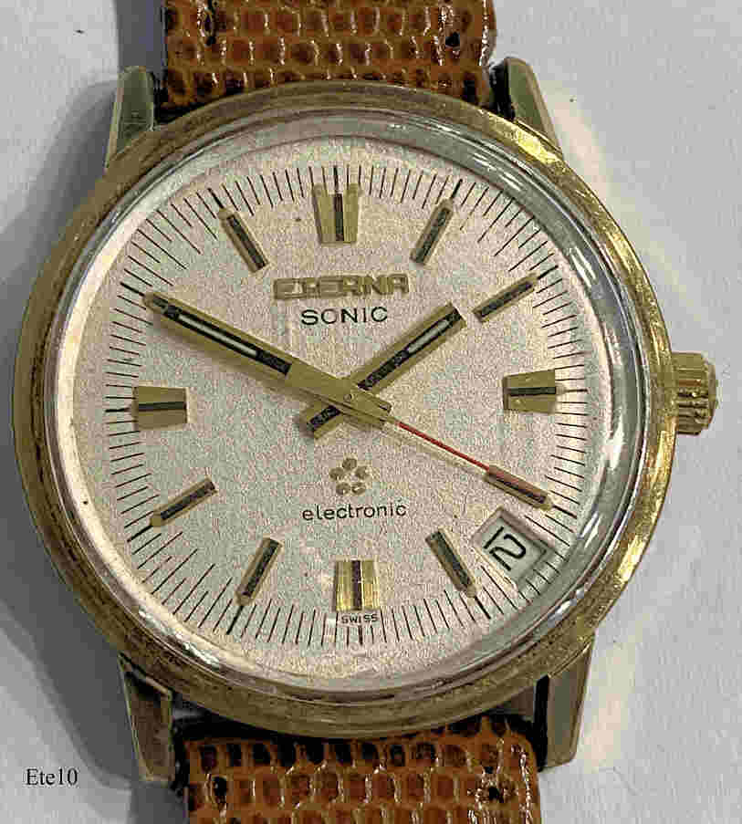 This is an Eterna Sonic with gold plated case in a very slim design, date at 4. The movement is an Eterna 1550 (ETA 9162 ), signed front: ”ETERNA, Sonic, Electronic”, back:”Water Resistant, 5531641”, inside: ”ETERNA WATCH Co, 1550, Unadjusted, 12 Jewels”. The watch has a brown, lizard shaped strap.