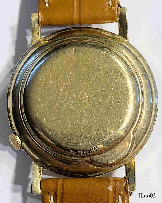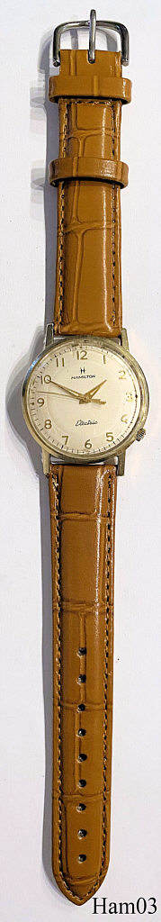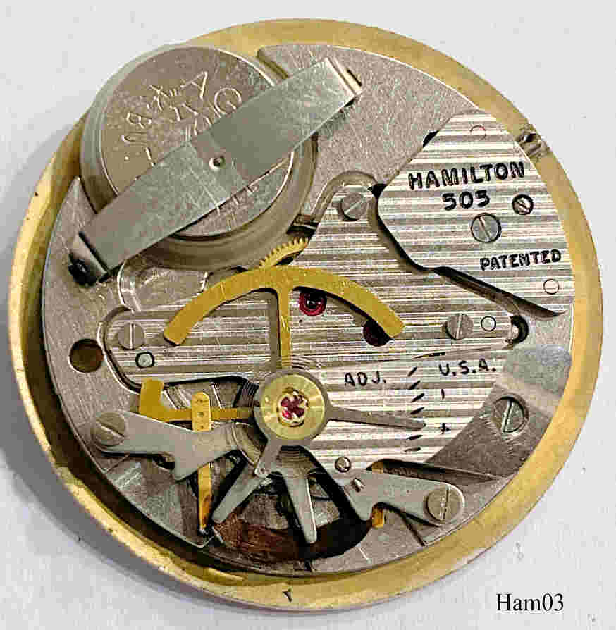 Diese Hamilton “Nautilus” ist aus dem Jahre 1957 und wird durch ein Caliber 505 getrieben. Dieses Werk ist die verbesserte Version des sehr empfindlichen 500A Werkes, man hat u.A. die Kontaktdrähte anders angeordnet. Diese Uhr hat keine abnehmbare Rückwand, an das Werk kommt man nur durch Abnehmen des Glases. Bezeichnet vorn: “Hamilton, Electric”, hinten: “Hamilton, 10K, Rolled Gold Plate”, innen: “Hamilton, 505, Patented, U.S.A.”