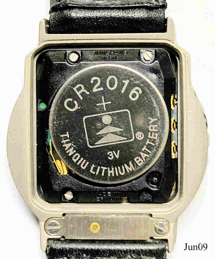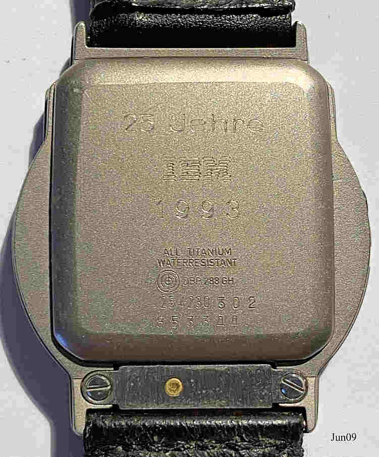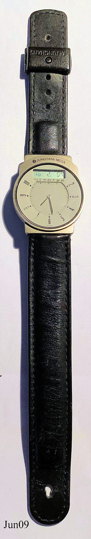 Dies ist eine Junghans Mega Funkuhr. Es ist die erste Analog Funkuhr auf dem Markt und ist meine Jubiläumsuhr für 25 Jahre Mitarbeit bei der Firma IBM. Sie hat ein Titan Gehäuse in grau, mit grauem Zifferblatt und schwarzen Ziffern. Das Lederarmband mit integrierter Antenne ist schwarz. Beschriftet: ”Junghans Mega”, Rückseite: ”25 Jahre, IBM, 1993, All Titanium, Waterresistant, DBP 288 GH, 254230 3 0 2, 853344”. Die gleiche Uhr wurde von Bulova verkauft.