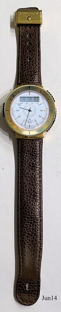 Eine Junghans Mega Alarm Chrono Funkuhr mit sehr eigenwillig aufgebautem Gehäuse. Messinggehäuse und Edelstahl Rückwand. Beschriftet: ”Junghans Mega”, hinten: “All Stainless Steel, Water Resistant, DBP 288 GH, 29 7400 405, 743745”, digitales Display bei der “12” mit Tag, Monat, Sekunden und Wochentags- Anzeige. Alternativ: Alarm1, Alarm2, Countdown, Stoppuhr