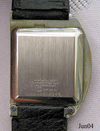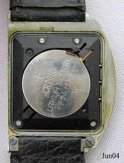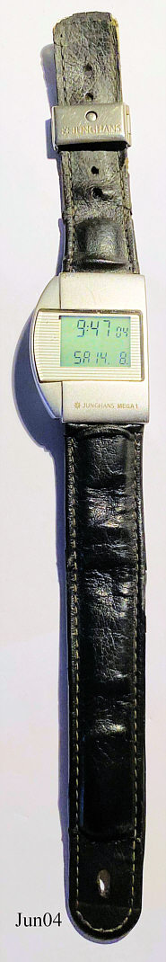 The Mega 1 by Junghans, the first radio controlled wrist watch in the world. The antenna is integrated in the bandand receives the long wave signals of the DCF 77 Cesium clock. Display: hours / Minuten / Seconds, day / date /  Month. Signed front: “Junghans MEGA 1”, back: ”Base Metal Bezel, Stainless Steel Back, Waterresistant,DBP 288 GH, 26/0010009”, Caliber J 604