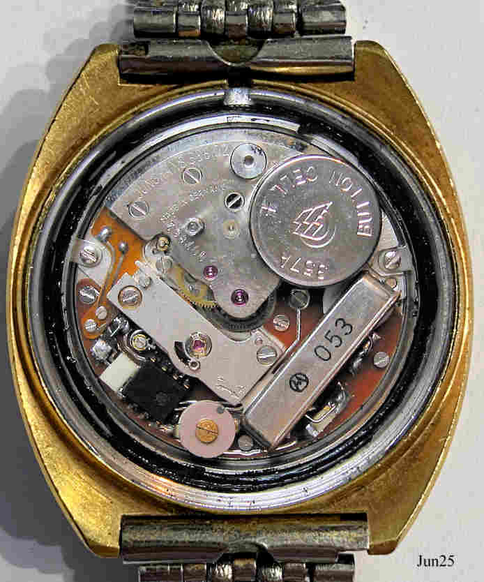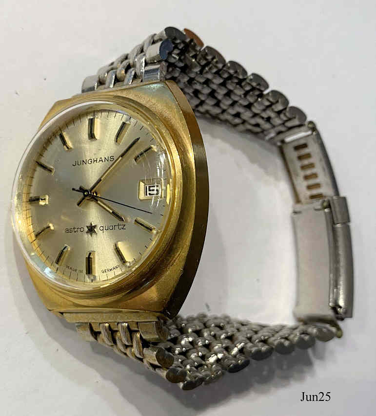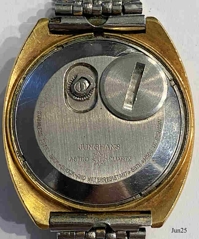 A Junghans Astro Quartz, the first German Analog Quartz watch. Caliber 666.02 from 1974 of a later Series, with a Quartz from Motorola. Signed front: ”JUNGHANS, Astro Quartz, Made in Germany”, back: ”Junghans, Astro Quartz, Stainless Steel back, Shock and Water Resistant, 5 ATU, Made in Germany”, On the back a screw-on battery compartment and the crown.