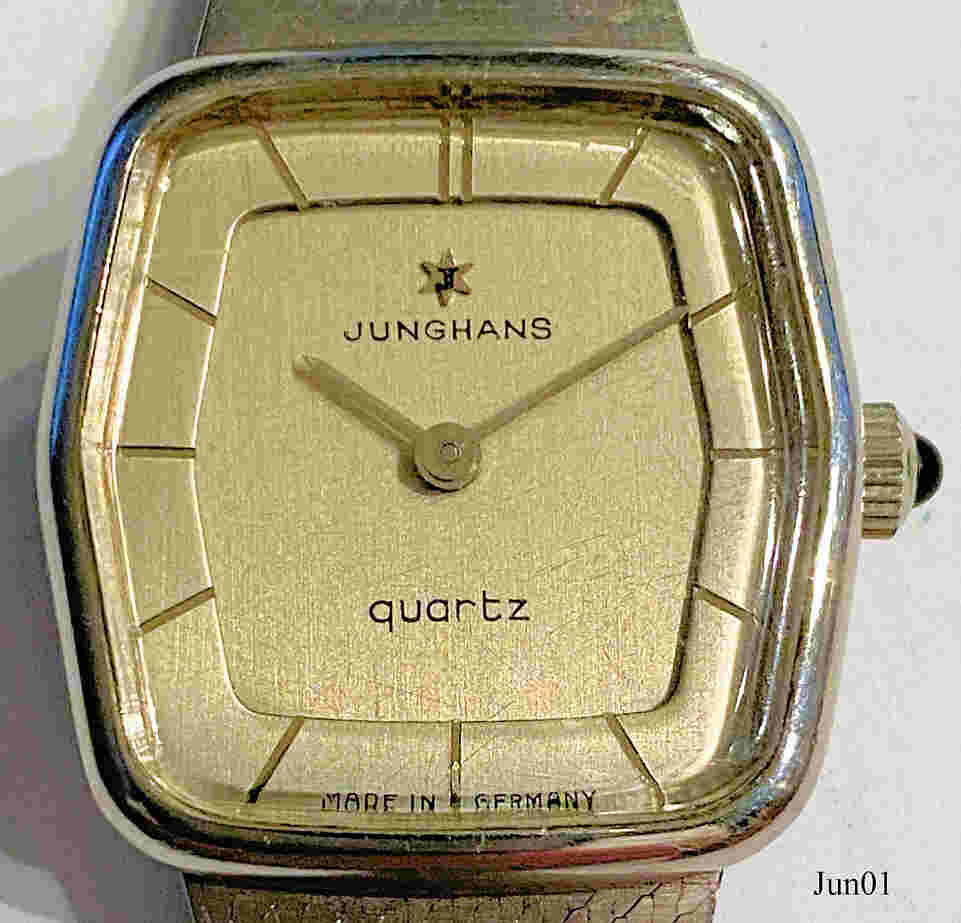 Eine Junghans Damen Schmuck Armbanduhr in Edelstahl. Inschrift vorn: “Junghans, Quartz”, hinten: ”JUNGHANS, Made in Germany, Stainless Steel , Shock Resistant/ DIN, 15-3871”, innen: “Five 5 Jewels, 632.51, Germany, Unadjusted”. Sehr geschmackvolles geschliffenes Milanaisearmband mit matt silberner Oberfläche. Siehe auch die passende Herrenuhr.