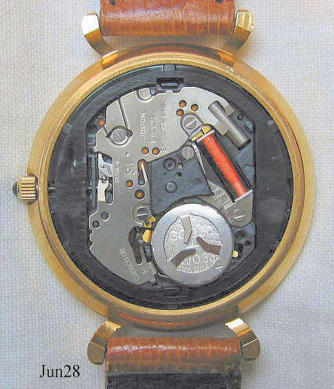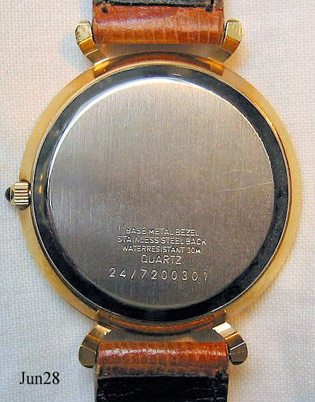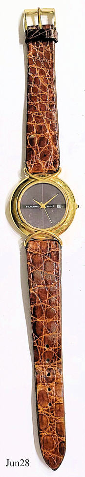 A Junghans Solar watch with Calendar at 3, black gem in the crown and very beautiful lugs. The dial is a big solar cell, generating electric power through sunlight and accumulating it in a Capacitor. This capacitor then drives a normal quartz movement, here a Shiojiri V122A. Signed front:” Junghans Solar 1”, back:” Base Metal Bezel, Stainless Steel Back, Water Resistant 30m, QUARTZ, 24-7200301”, inside: “Japan, V122A, Shiojiri Ltd., One 1 Jewel, Unadjusted”. Brown leather band.