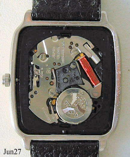 Eine Junghans Solar Armbanduhr mit Kalender bei der drei. Das Zifferblatt ist eine große Solarzelle, die bei Sonnen Einstrahlung Strom erzeugt und in einem Kondensator speichert. Dieser Kondensator treibt dann eine normale Quartz Uhr an. Inschrift vorn:”Junghans, Solar 1”, hinten:” Stainless Steel, Water Resistant 30m, QUARTZ, 24-4805.01”, innen: “Japan, V122A, Shiojiri Watch Co.Unadjusted, One 1 Jewel”. Schwarzes Lederarmband