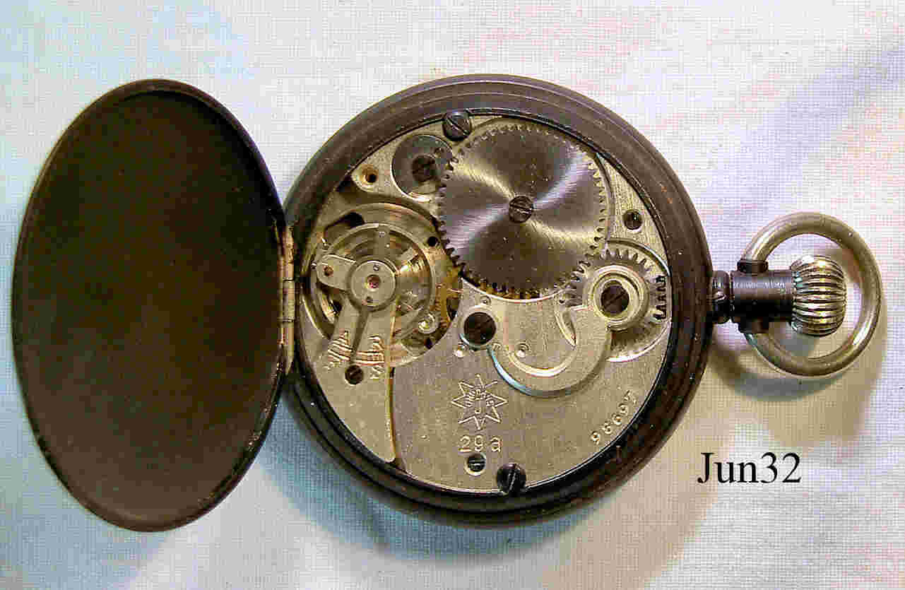 Eine Junghans Stoppuhr mit schwarzem Base Metal Gehäuse. Zeiger und Ziffern in schwarz, Zifferblatt cremefarben. Beschriftet außen: “Junghans”, Innen: ”Junghans, 29a, 98697”, hinten: ”A.W.M., Anl. Mb. 29/2” Kaliber Junghans 29a.