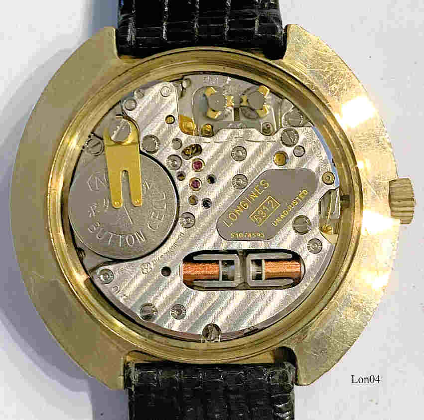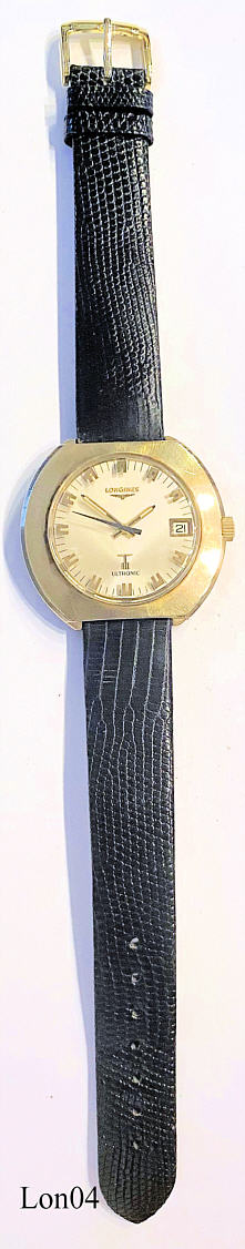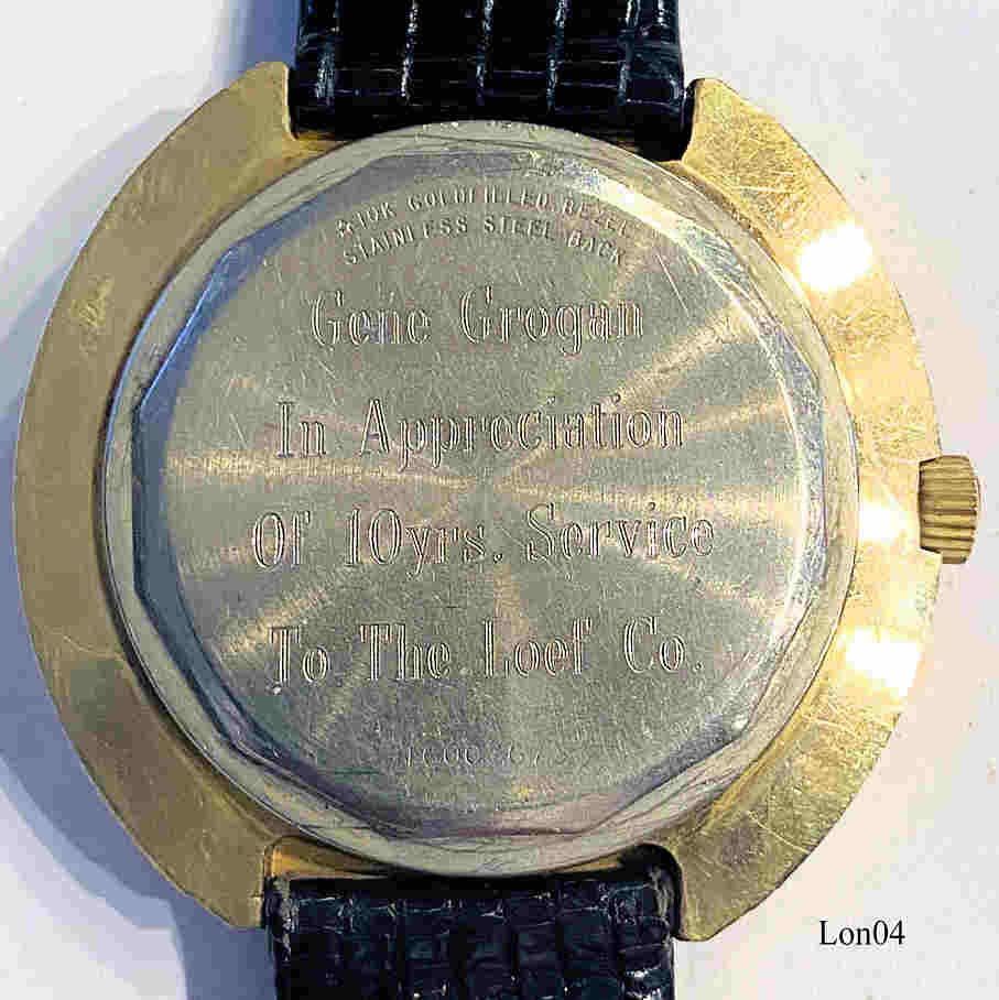 Dies ist eine Longines Ultronic, Werk N° 51074593, Caliber 6312, ESA 9162, 14K Goldauflage, verschraubter Edelstahlboden. Beschriftet vorn: ”Longines, Ultronic”, hinten: ”10 K Goldfilled Bezel, Stainless Steel Back, Gene Grogan, In Appreciation, of 10 yrs Service, To The Loef Co., 16003673”, innen: “Longines, 6912, 51074593, unadjusted, Twelve 12 Jewels”