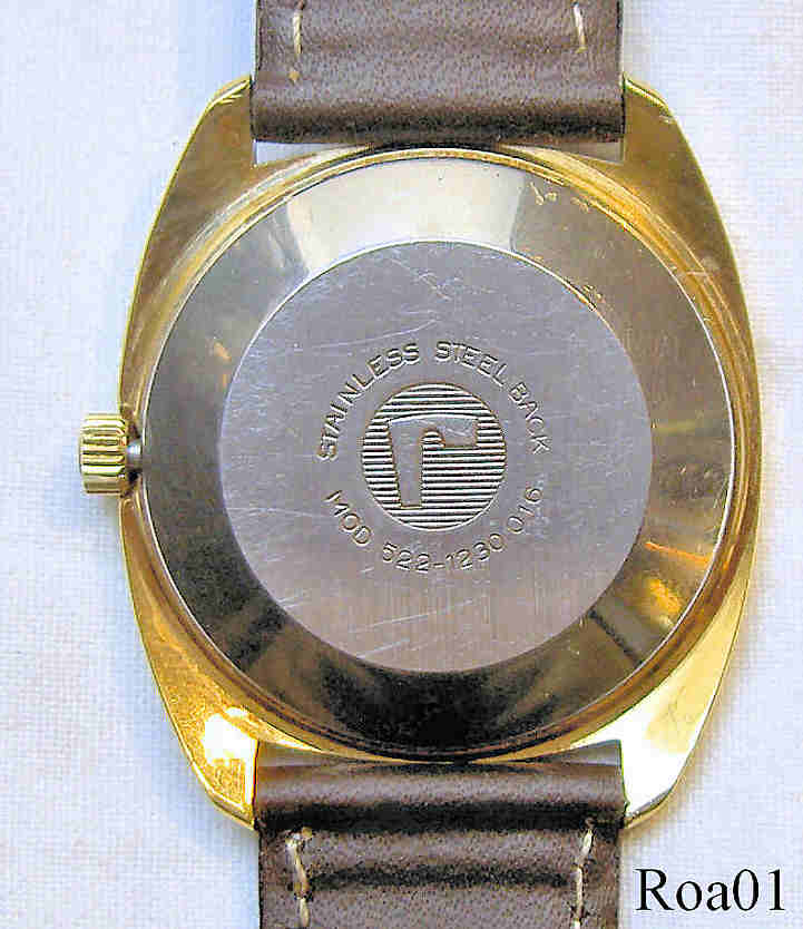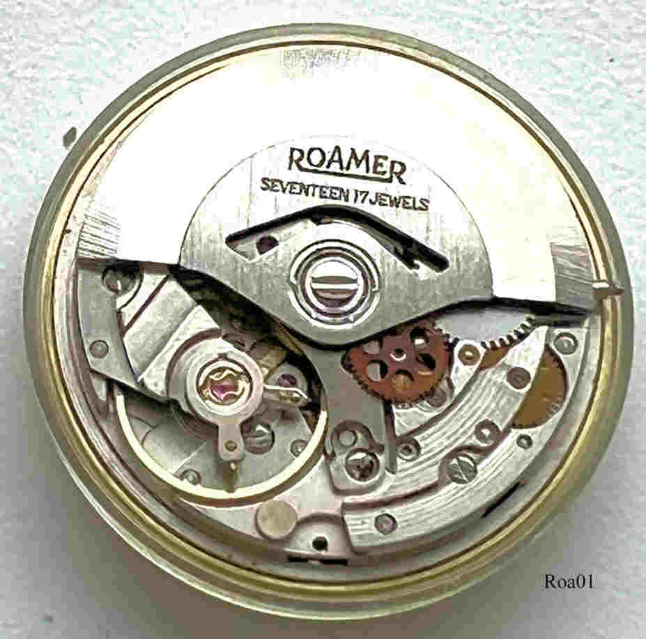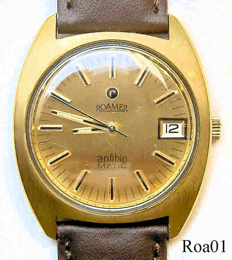 Eine Roamer AnfibioMatic Uhr mit Roamer MST 522 Werk. Base Metal Gehäuse mit braunem Lederarmband. Beschriftet vorn:” Roamer, Anfibio, Matic”, hinten:” Stainless Steel Back, MOD. 522-1230 016”, innen:” Roamer, Seventeen Jewels, Roamer Watch Co., MST 522”. Date bei der 3. Caliber Roamer MST 522.