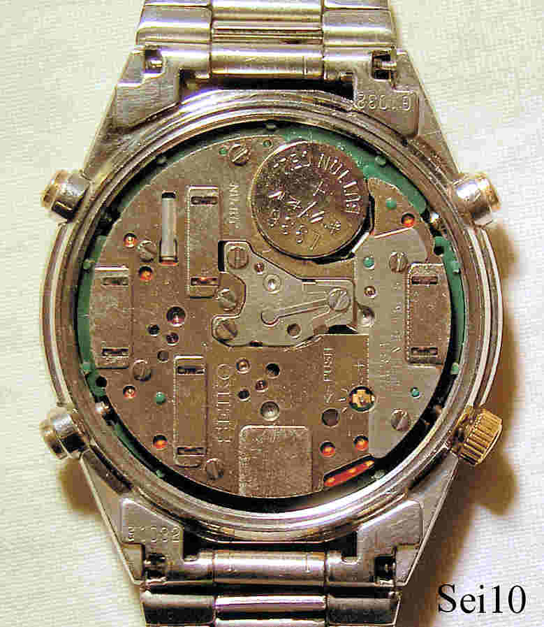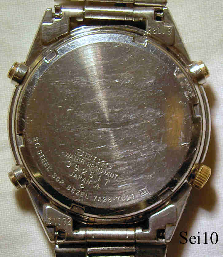 Dies ist der erste elektronische Chronograf. Kein Datum, Kaliber 7A28, Beschriftung vorn:” Seiko, Quartz, Chronograph“, innen:”Seiko, thirteen 13 Jewels, 7A28A, Japan”, hinten:”Seiko, Water Resistant, 392511, Japan A, St. Steel, SGP Bezel, 7A28-7020” mit Stahlboden und Twotone Gliederarmband.