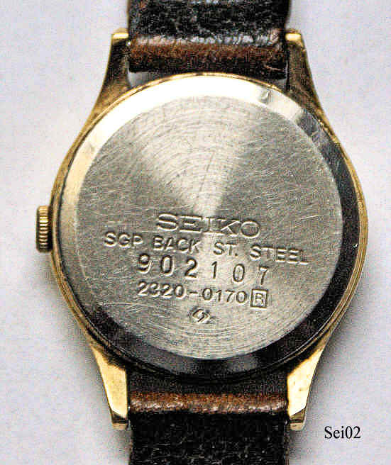 Dies ist eine vergoldete Seiko Damenuhr mit sehr schönem schwarzen Zifferblatt, die Striche sind nur eingeritzt und erscheinen durch die Lichtbrechung, die 12 ist ein goldener Strich, Zeiger ebenfalls gold. Beschriftung:” SEIKO, SGP Back ST. Steel, 902107, 2320-0170, R“ mit verschraubtem Stahlboden und braunem Lederarmband.