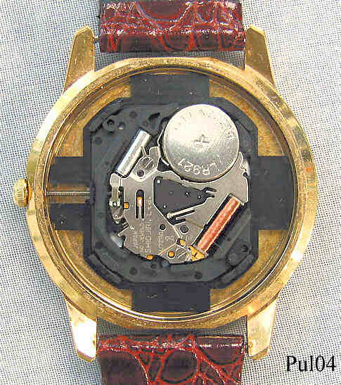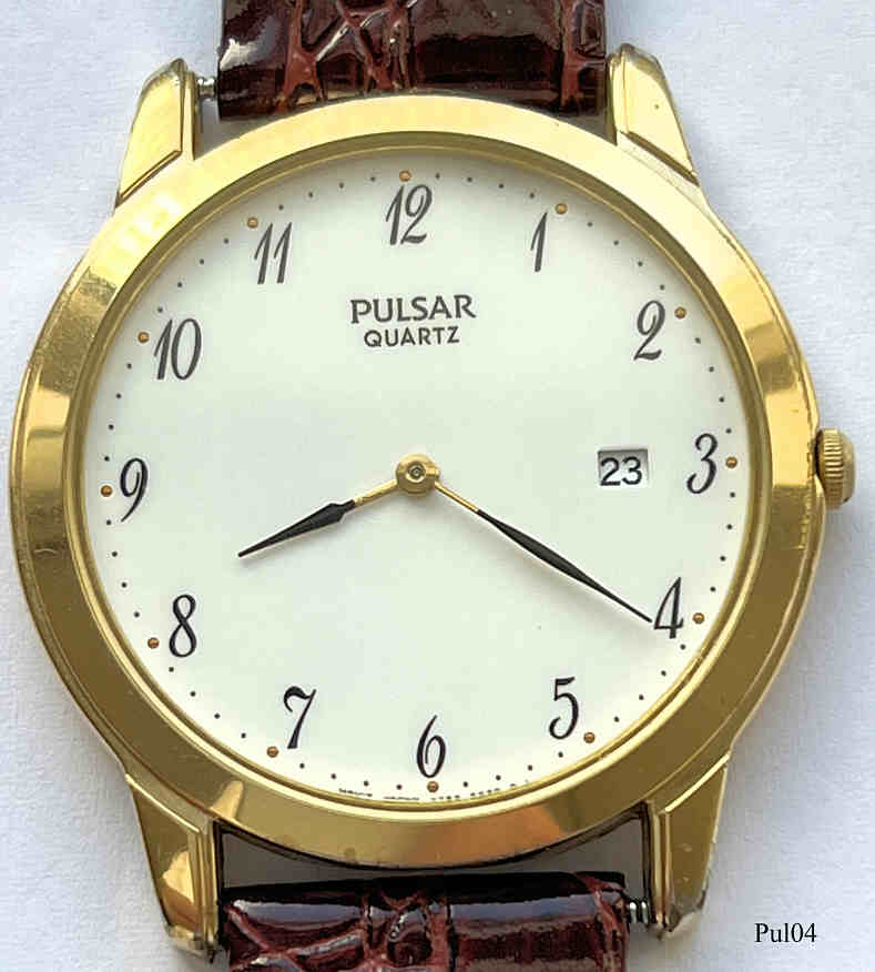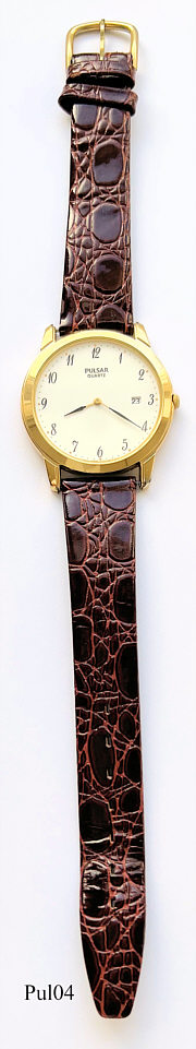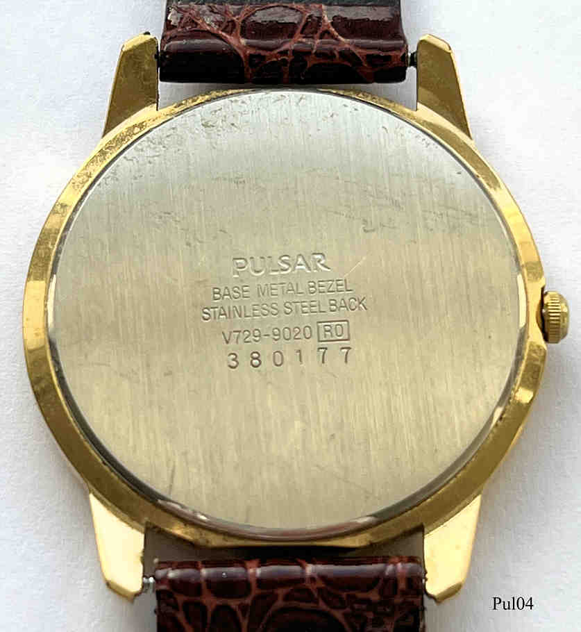 Dies ist eine vergoldete Pulsar Herrenuhr mit sehr schönem emailliertem Zifferblatt, sowie sehr kunstvollen Ziffern. Datum bei der 3. Beschriftung vorn: ”PULSAR, Quartz, Mvmt. Japan, V729 9020 R1“, hinten: “PULSAR, Base Metal Bezel, Stainless Steel Back, V729-9020 R0, 380177”, innen: “Japan, No Jewels, Shiojiri Ltd., V927A”. Stahlboden und rotbraunes Straußenleder Armband.