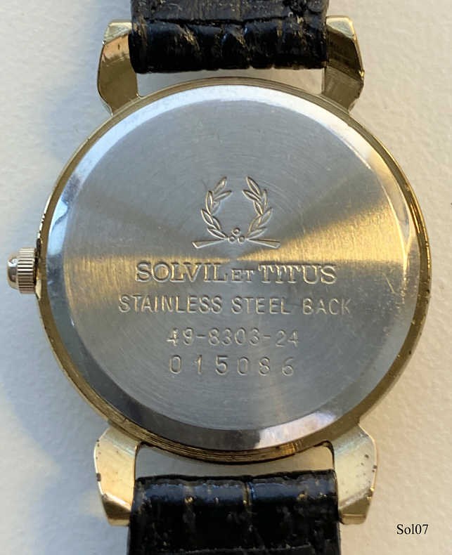 Dies ist eine Solvil & Titus Damen Quartzuhr im goldfarbenen Gehäuse und schwarzem Lederarmband. Beschriftung: ”Solvil et Titus, Quartz, Roma 1887”, hinten: ”Solvil et Titus Stainless Steel Back, 49-8303-24, 015086“, innen: “Swiss Parts, Assbly HK, Harley Ronda SA, One Jewel, Unadjusted, 784”. Base Metal Gehäuse mit Edelstahl Boden. Der Zeiger mit dem roten Halbmond zeigt das Datum. Harley Ronda 784 Kaliber.