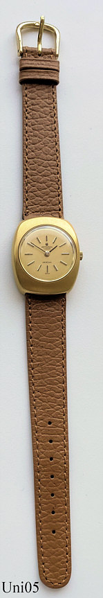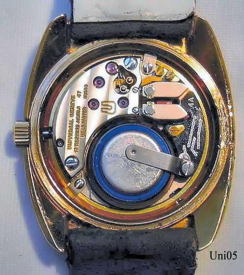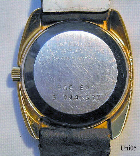 A Universal Genève Unisonic with the Bulova 2300 movement. Mvt. N° 5044522, Universal Caliber 47, Reference Nr.: 553 100/01, Signed front: ”Universal, Genève, Unisonic, Swiss”, back: ”16K heavy gold, Electroplate 1/1000, Stainless Steel Back, 548 501, 5 044 522”, inside: “Universal Geneve, 13 Thirteen Jewels, 47, Unadjusted, Swiss”.