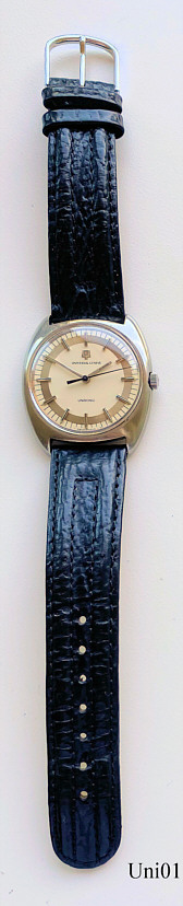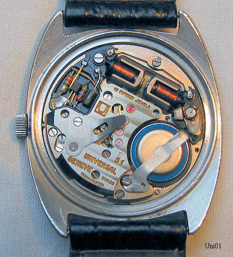 Dies ist eine Universal Genève Unisonic, neben der Citizen Hisonic die einzige Stimmgabeluhr mit dem Bulova 2180 Werk. Werk N° 2’836’668, Universal Caliber 1-51, Referenz Nr.: 851101, Beschriftet vorn: ”Universal Geneve, Unisonic, -Swiss Made - T”, hinten: “851101, 2836668”, innen: ”15 Fifteen Jewels, 1-51, Universal Geneve, unadjusted”