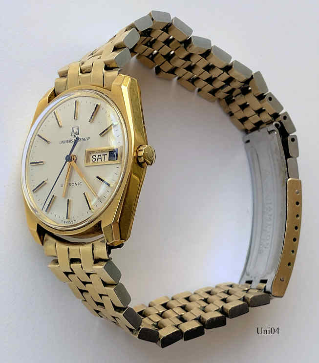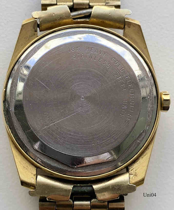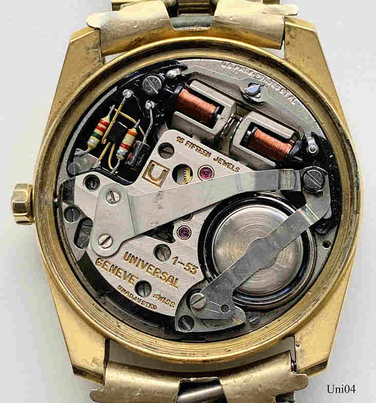 Dies ist eine Universal Genève Unisonic, neben der Citizen Hisonic die einzige Stimmgabeluhr mit dem Bulova 2182 Werk. Werk N° 2’660’108, Universal Caliber 1-53, Referenz Nr.: 553 100/01, Beschriftet vorn:” Universal Geneve, Unisonic, Swiss Made T” hinten: “16K heavy gold electroplate, stainless steel back, 553 100/01, 2’660’108”, innen:” 15 Fifteen Jewels, 1-53, Universal Geneve, unadjusted”, Tag und Datum bei der 3.
