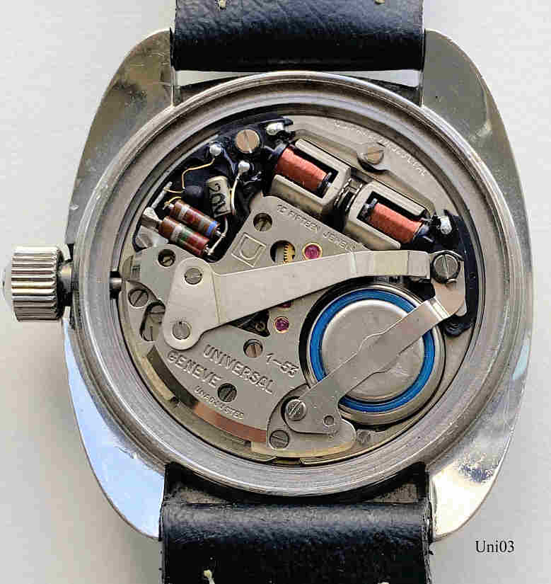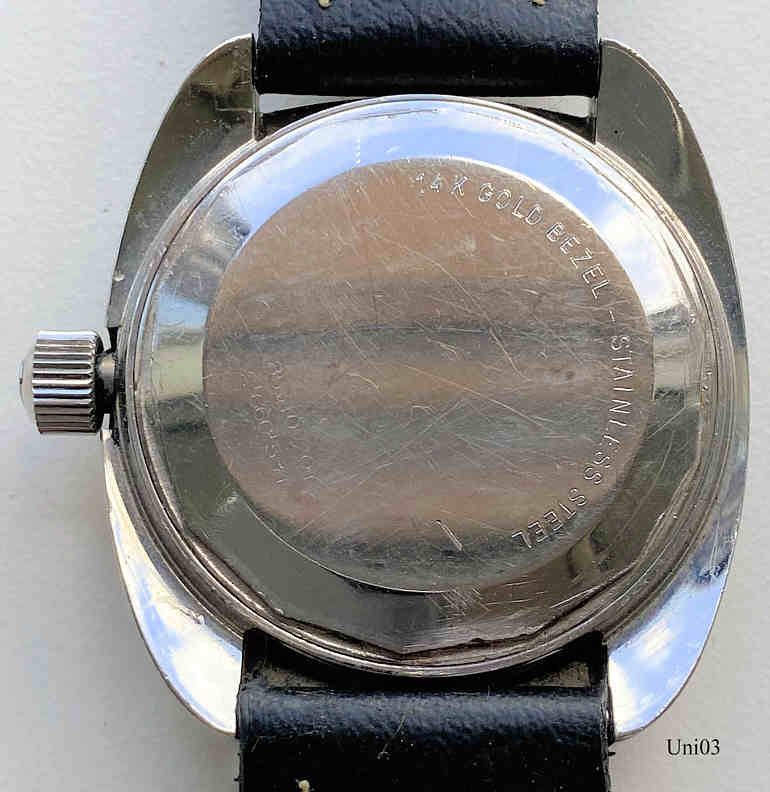 A Universal Genève Unisonic, neben der Citizen Hisonic die einzige Stimmgabeluhr mit dem Bulova 2182 Werk. Werk N° 2’660’584, Universal Caliber 1-53, Reference Nr.: 853 102/01, Signed front:” Universal Geneve, Unisonic, Swiss T”, back: ”14K gold Bezel, Stainless Steel , 853 102/01, 2’660’584”, inside:” 15 Fifteen Jewels, 1-53, Universal Geneve, unadjusted”, Day / Date at 3.
