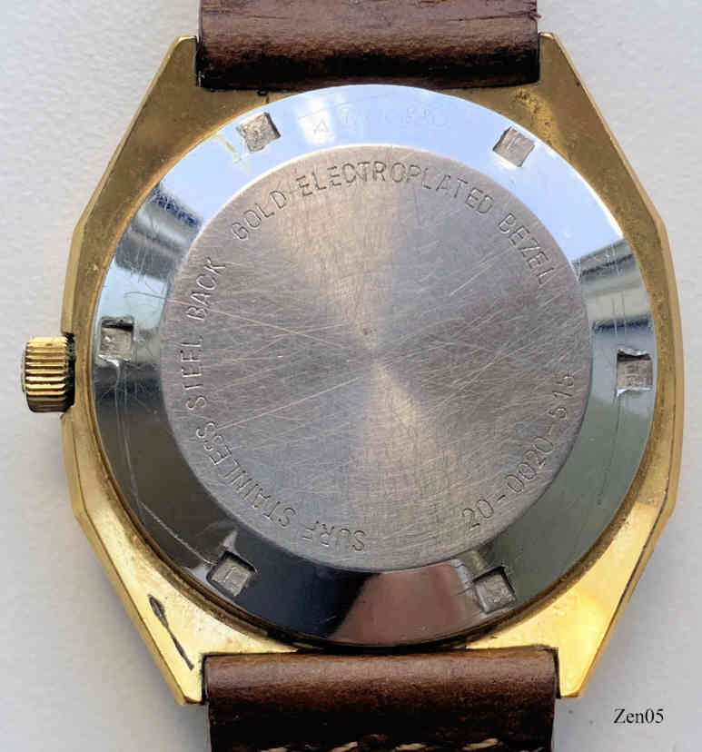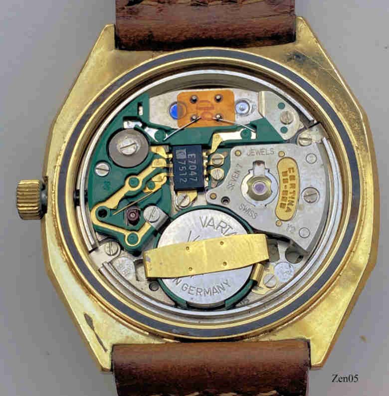 Eine Zenith Quartz Uhr mit Certina 29-262 Werk, Aufschrift vorn:”Zenith, XL-Tronic, Quartz”, innen:” Certina, 29-262, seven 7 Jewels, Swiss”, hinten:” Surf Stainless Steel Back, Gold Electroplated Bezel, 20-0020-515”. Braunes handgenähtes Lederarmband