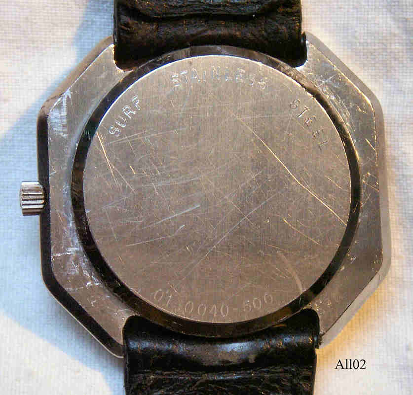 Dies ist eine Allegro Electronic Stimmgabeluhr mit Kalender in achteckigem Edelstahlgehäuse, ESA 9162, mit schwarzem Lederarmband . Beschriftet: “Allegro Electronic”, Rückseite: ”Surf Stainless Steel, 01-0040-500” innen: ”Zenith, 50.0, unadjusted, twelve 12 Jewels, Lic.Bulova + Pat. ESA”.