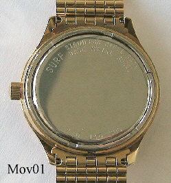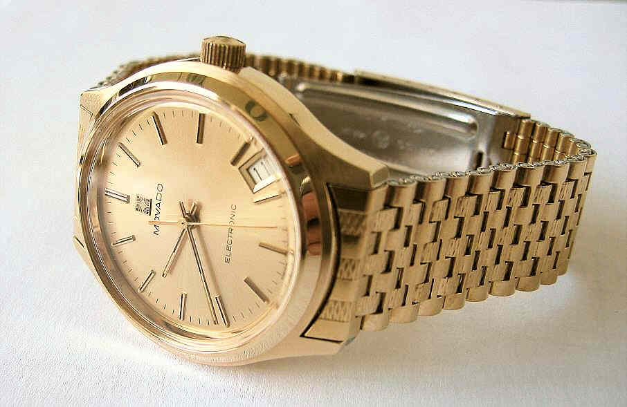 A Movado Electronic, a Swiss tuning fork watch from Zenith with the ETA tuning fork movement Caliber 9162, gold plated case, Stainless Steel back, date at 4. Signed front: “Movado, Electronic”, back: “Surf Stainless Steel Back, Base Metal Bezel, 270-140-500”, Goldtone Metal band with Movado clasp . Zenith Caliber 50.0