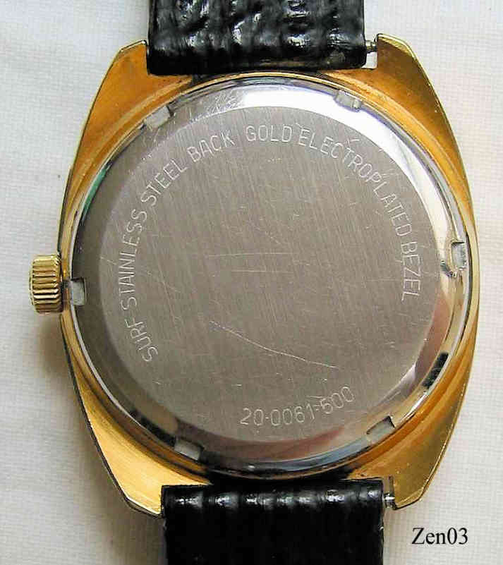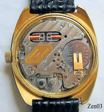 Dies ist eine Zenith XL-Tronic, eine Schweizer Stimmgabeluhr mit dem ETA Strimmgabel Werk, Kaliber 9162, vergoldetes Gehäuse, Datum bei der 4. Beschriftet vorn: “Zenith, XL-Tronic, Swiss Made”, innen: “Zenith, 50.0, Unadjusted, Twelve 12 Jewels, Lic. Bulova & Pat ETA Swiss”, hinten: ”Surf Stainless Steel Back, Gold Electroplated Bezel, 20-0061-500”, schwarzes Lederarmband. Zenith Kaliber 50.0