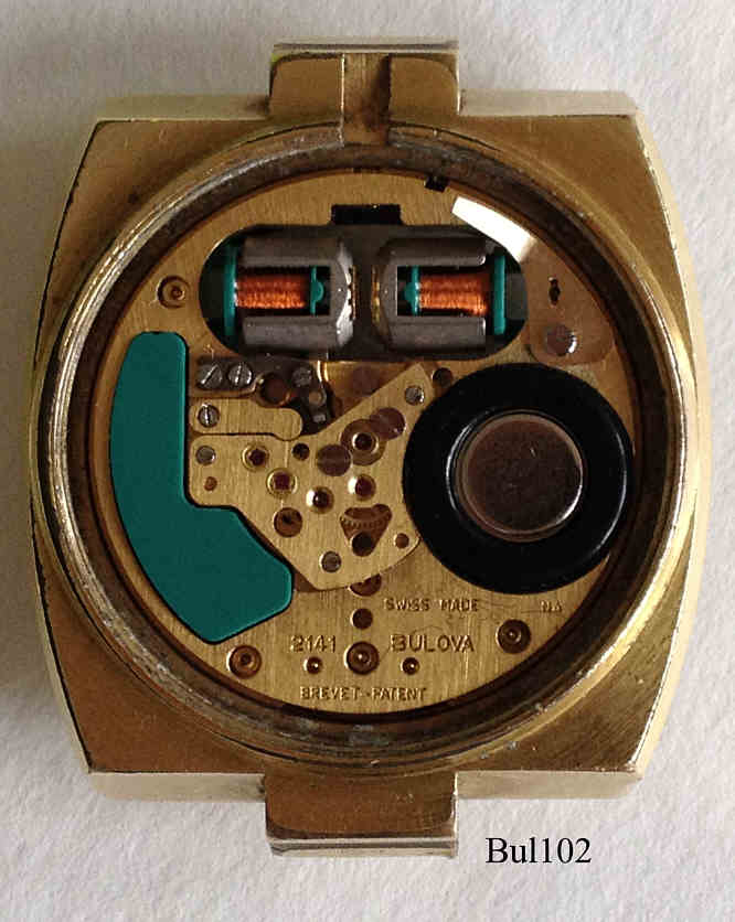 Bulova Spaceview 2141, signed front: ”Bulova, Accutron”, back: “Patented, Stainless Steel back, Water Resistant”, inside: “Swiss Made, N4, 2141, Bulova, Brevet-Patent”, Caliber 2141, Manufacturing date 1974 (N4), screw-on case back, clip lever on the back to adjust the time. Model 200.01.30