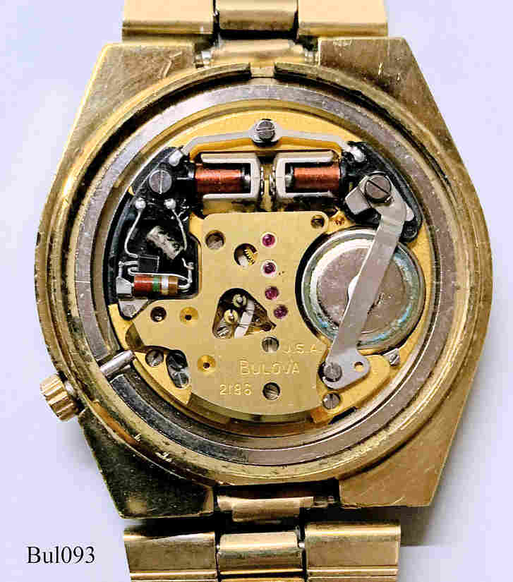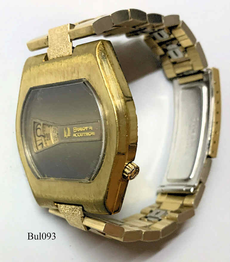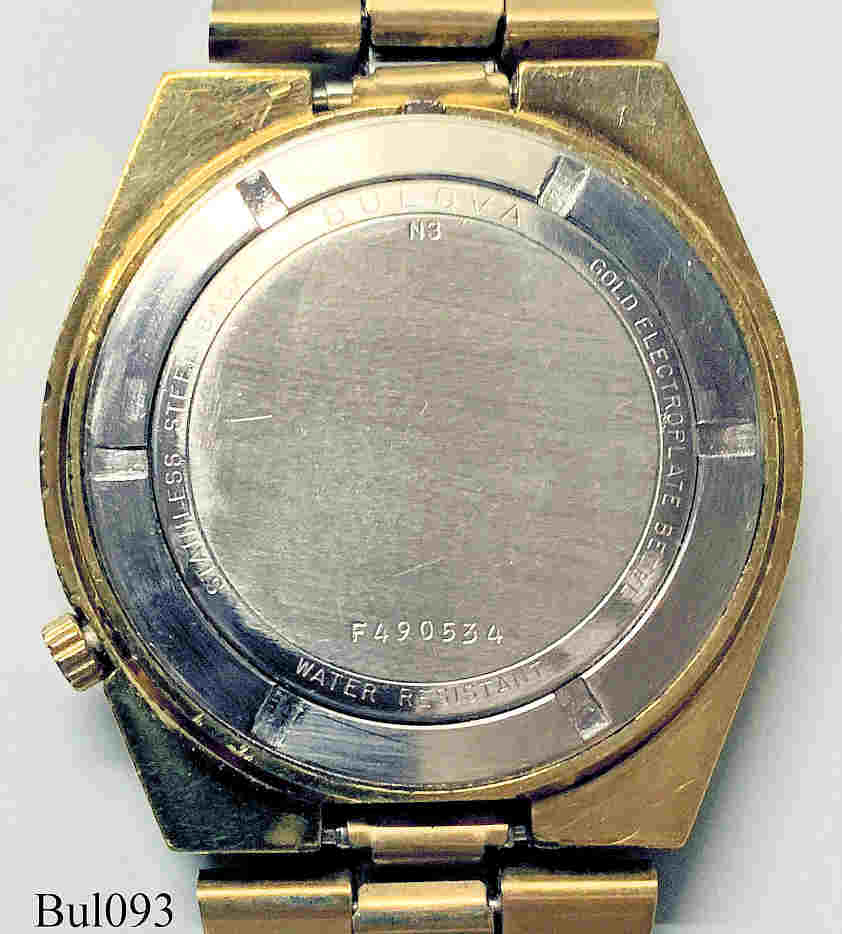 Eine Bulova Accutron Direct Read mit vergoldetem Gehäuse mit Sekunde, goldton Ziffernscheiben, Beschriftet vorn: “BULOVA, Accutron”, hinten: “Bulova, Stainless Steel Back, Water Resistant, Gold Electroplated Bezel, N3, F490534”, innen: “USA, Bulova, 2186”. Case #3316 , Caliber 2186, Herstelldatum 1973 (N3), Nr. F 490534, goldfarbenes Metallarmband. Dieses Kaliber ist wohl das seltenste der 218 Serie .