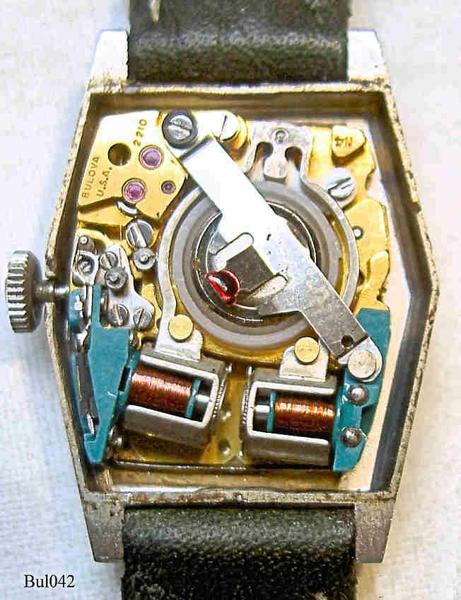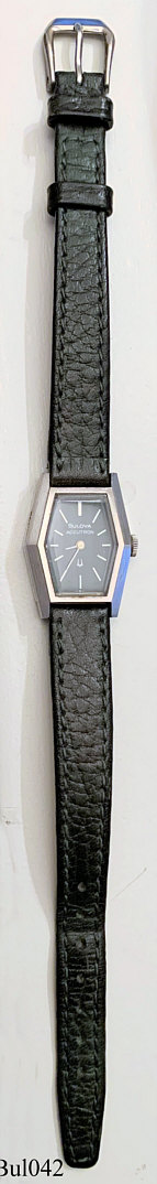 Eine Bulova Damen Accutron mit Edelstahlgehäuse, Beschriftet vorn: ”Bulova, Accutron”€¯, hinten: ”2 853927”€¯, innen: ”Bulova, USA, 2210, N4”, Caliber: 2210, Herstelldatum 1974 (N4), dunkelgrünes Lederarmband, wurde in 2001 als ”New old Stock”€¯ gekauft!