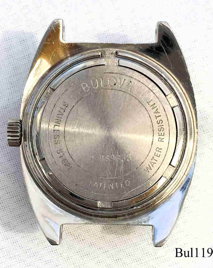 Eine Bulova Accutron Damenuhr mit Edelstahl Gehäuse im TV Look, Beschriftet vorn: “Bulova, Accutron, T Swiss T”, hinten: “2-889635, Bulova, Stainless Steel, patented, Water Resistant”, innen: “Patent, BulovaWatch Co., Swiss 13 Thirteen Jewels, Unadjusted, 2302”, Caliber 2302, kein Herstelldatum , Datum bei der 3. Gehäuse Nr. 7279