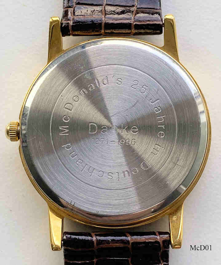 Eine Werbeuhr zum 25 jährigen Jubiläum von McDonalds in Deutschland. Die Uhr ist sehr interessant gemacht, eine polarisierte Acrylscheibe bildet den Sekundenzeiger und in Verbindung mit dem polarisierten Glas der Uhr ist das Zifferblatt nur bei 12 und 6 deutlich zu sehen, bei 3 und 9 ist es schwarz. Beschriftet innen: “ Prestige Time Co., Swiss Parts, Movement China, One 1 Jewel, ISA 1198”, hinten: ”Mc Donalds 25 Jahre in Deutschland, Danke, 1971 - 1996”