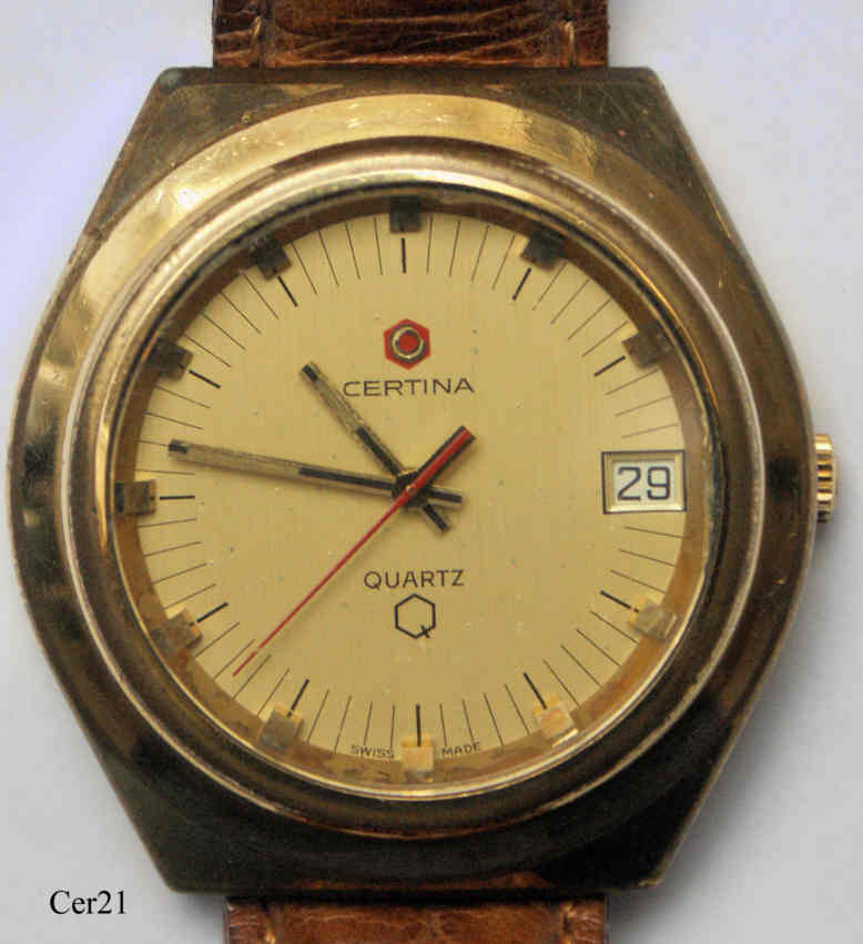 An early Certina Quartz watch, signed front: ”Certina, Quartz, Swiss Made”, inside: ”Seven 7 Jewels, Swiss, Y2”, back: ”9106 003, 9405397”. brass case, screw down back, Caliber ESA 9181.