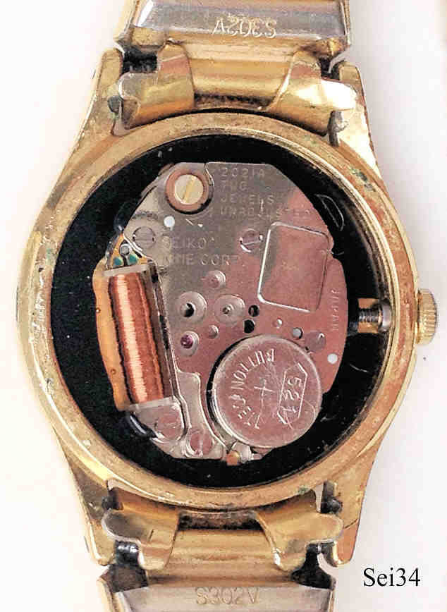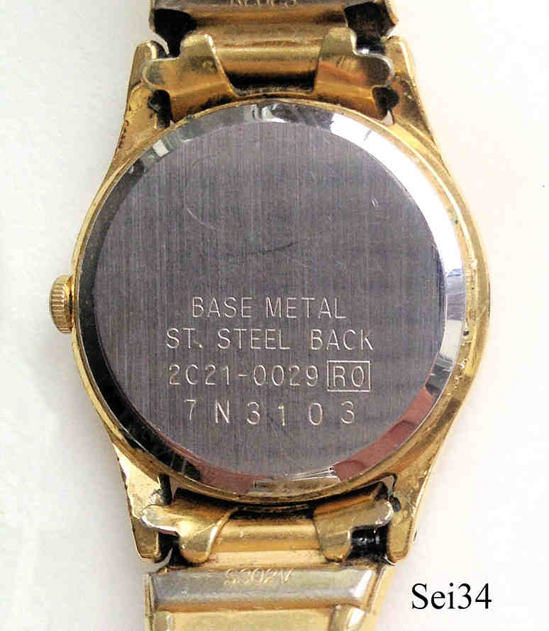 Dies ist eine vergoldete Seiko Damenuhr mit sehr schönem goldenem Zifferblatt und aufgesetzten Balken statt der Zahlen, Zeiger ebenfalls gold. Beschriftung vorn:” SEIKO, Quartz, Japan, 2C21 0050 R“, hinten: “Base Metal, Stainless Steel Back, 2C21-0029 RO, 7N3103”, innen: “2021A, Two Jewels, Unadjusted, Seiko Time Corp., Japan”. mit geklemmtem Stahlboden und goldenem Flexarmband.