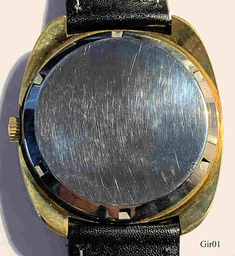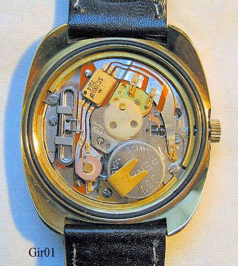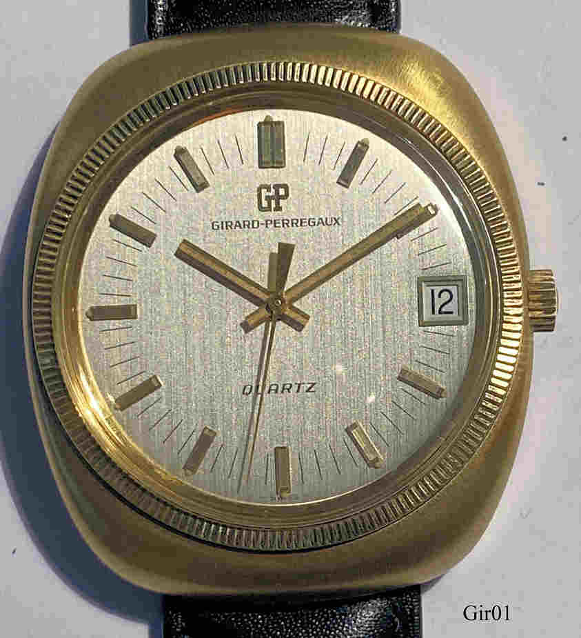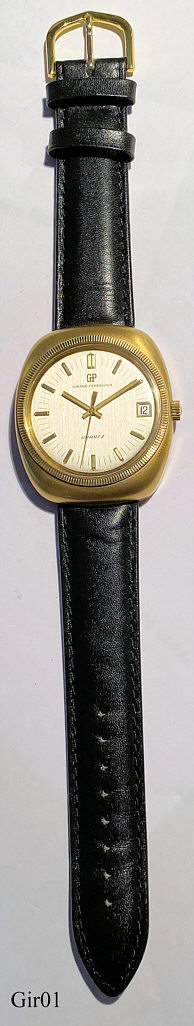 A Girard Perregaux Quartz, the worlds first analogue Quartz watch with stepping second hand. GP movement Caliber 352, Date at 3. Signed front: “GP, Girard Perregaux, Quartz”, inside: ”Girard Perregaux, 352-543, 144253, unadjusted, Swiss, No Jewels”, black leather band. Bought NOS 12/2004. This watch is an early model, using the brazilian natural quartz, the later models after 1971 then used the artificially grown quartz in tuning fork shape, as used in all quartz watches since then.