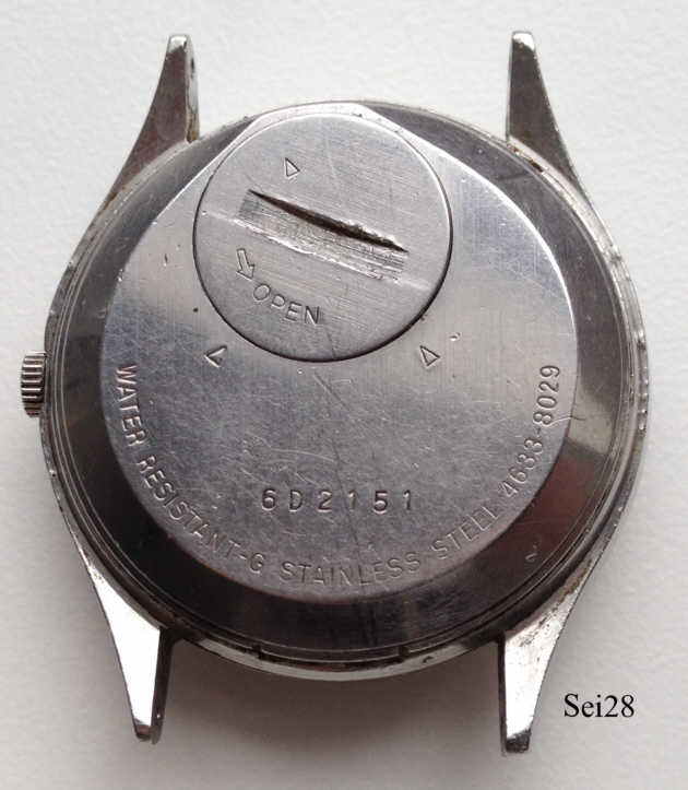 A stainless steel mans watch from Seiko. Day-date at 3, signed front: “Seiko, Quartz, SQ, 4004”, inside: “Unadjusted, Seiko Time Corp.,Two 2 Jewels, 4633A”, back: ”Water Resistant-G, Stainless Steel, 4633-8029”, Stainless Steel Case. Caliber Seiko 4633A.