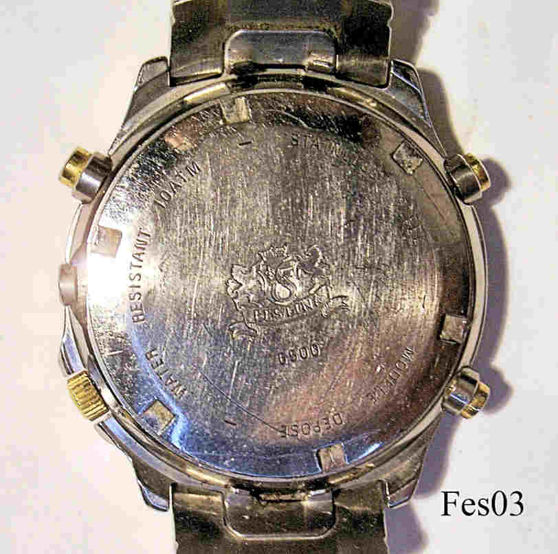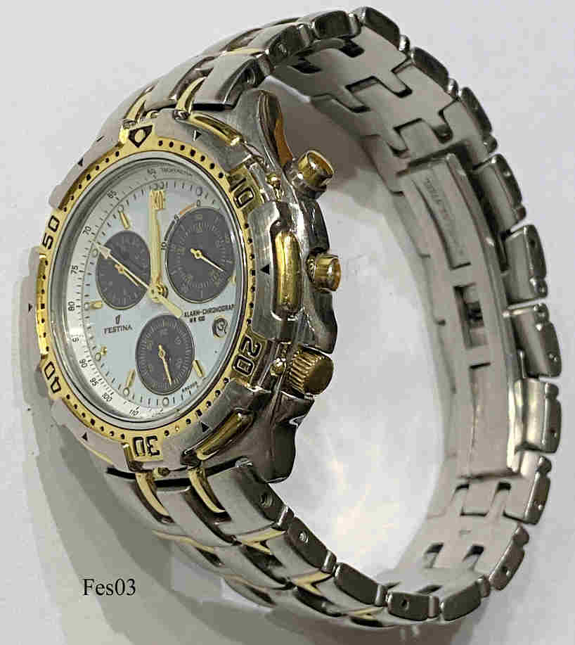 Ein Chronograph von Festina mit weißem Zifferblatt und drei Chronographenskalen in schwarz. Beschriftet: “Festina, Alarm Chronograph, WR100, 650005”, hinten: ”Festina, Water Resistant 10 ATM, Stainless Steel, Modele Depose, 6500”, innen: “Miyota Co., No Jewels, 3S10, Japan” . Datum bei der 4, integriertes Stahlarmband.