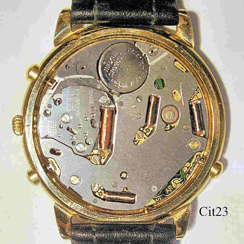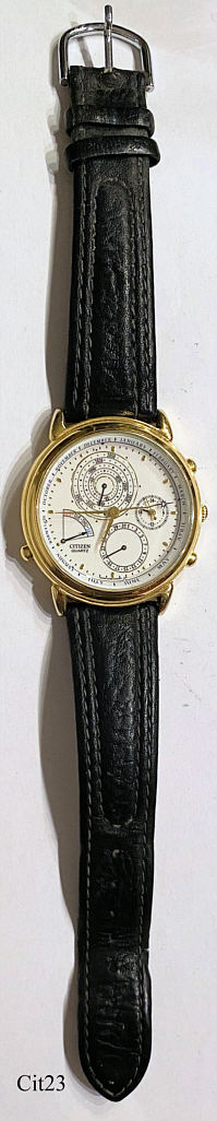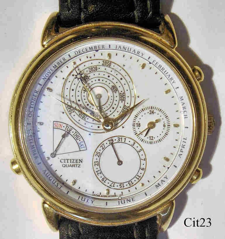 Dies ist eine außergewöhnliche Citizen Quartz Uhr mit vollem ewigen Kalender. Der Kalender wird auf ungewöhnliche Weise angezeigt: Jahr auf der Skala bei der 12, Monat durch den Zeiger mit dem Sonnensymbol auf dem Rand des Zifferblattes, Tag bei der 8 und Datum bei der 6. GMT zeigt der kleine Zeiger bei der 3, der große zeigt die Sekunde. Beschriftet vorn: ”CITIZEN, Quartz”, Innen: ”Citizen, Watch Co, No 0 Jewels, 280-73”, Rückseite: ”Base Metal YP, 6700-780072 TA, Japan -> 12,INI 2000-12-31- SUN, Citizen Watch Co., Water Resist, GN-4-S, 9300964”, Base Metal Gehäuse, schwarzes Lederband.