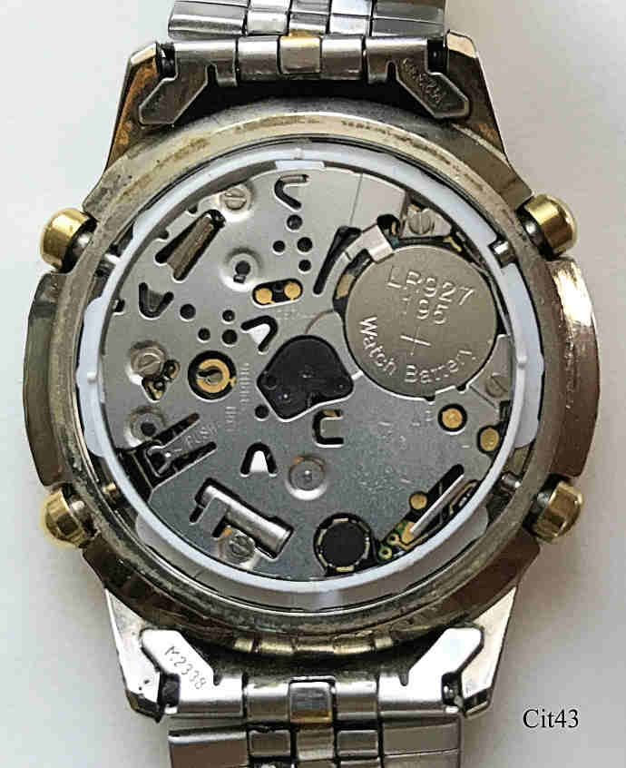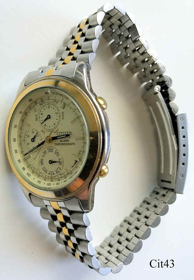 A Citizen Chronograph with sTitanium case and back. Caliber Citizen 6870A, Date at 3, signed front: “Citizen, Titanium, Chronograph, WR100“, back: “ Citizen Watch Co, Water.Resist Base Metal MPDG, 6850-G82097 K, 571273, GN-4-S, Japan->9”, inside: “Citizen Watch Co, No Jewels, 6870A, Japan”. Two colors Stainless band.