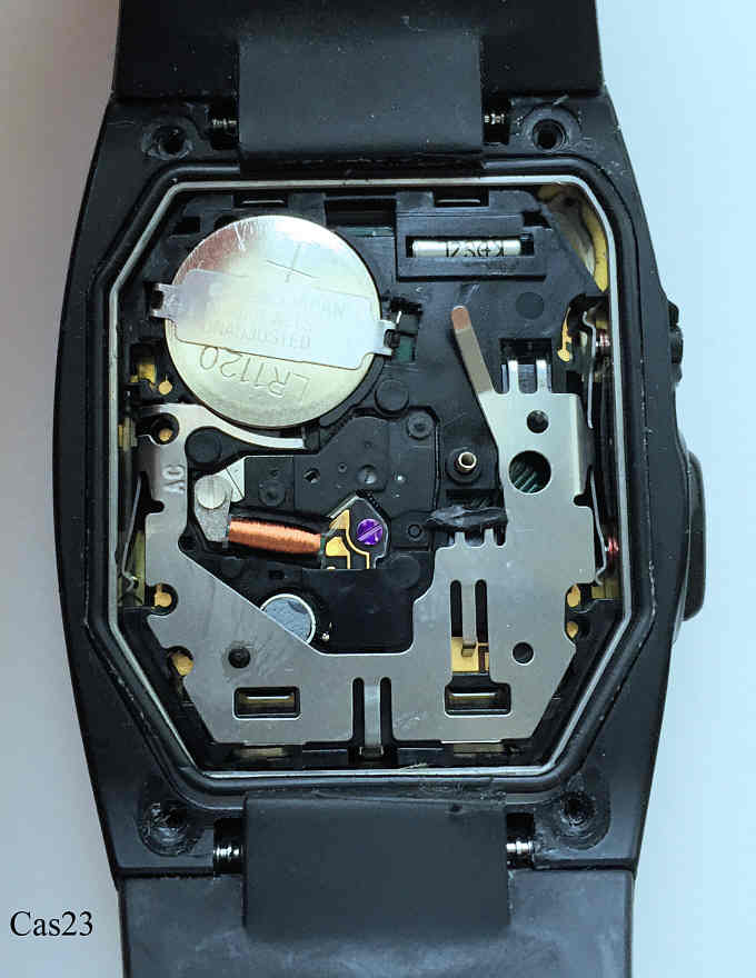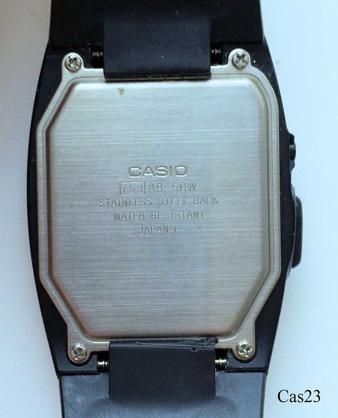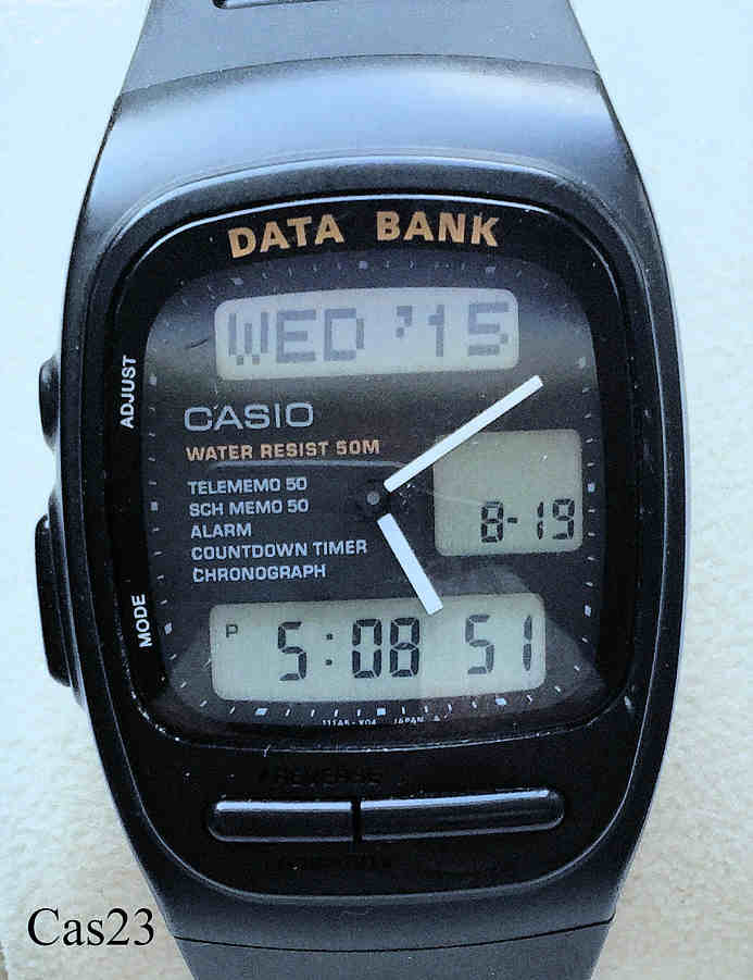 Eine moderne Digitaluhr von Casio mit Datenbank. Kunststoff Gehäuse mit integriertem Kautschuk Armband. Drei LCD Anzeigefelder: Oben: Tag, Jahr; Mitte: Monat, Datum; Unten: Std. Min. Sek. Beschriftet vorn: ”Data Bank, Casio, Water Resist 50m , Telememo 50, Sch Memo 50, Alarm, Countdown Timer, Chronograph.”, innen: ”Casio, Japan, No (0) Jewels, Unadjusted”, hinten: ”Casio, 753, AB-50W, Stainless Steel Back, Water Resistant, Japan, C”.