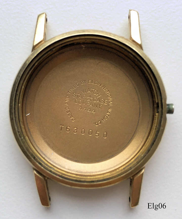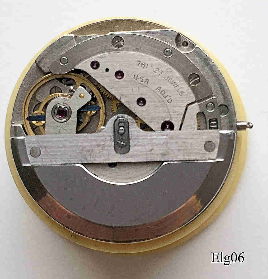 Dies ist eine Elgin Automatik Uhr mit eingelötetem Edelstahlboden und geteilter Stellwelle. Interessant auch die ungewöhnliche Unruh Konstruktion. Beschriftet vorn: ”Elgin, 27 Jewels, Selfwinding, American Made”, hinten: “Durapower, Waterproof, Resistant to Shock - Dust and Magnetism, Elgin, 10K RGP Bezel, Stainless Steel Back”, innen: “761, 27 Jewels, USA, ADJ’d”. Die Uhr hat ein geschlossenes Gehäuse und muß von der Glasseite geöffnet werden, Kaliber Elgin 761.