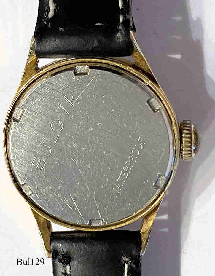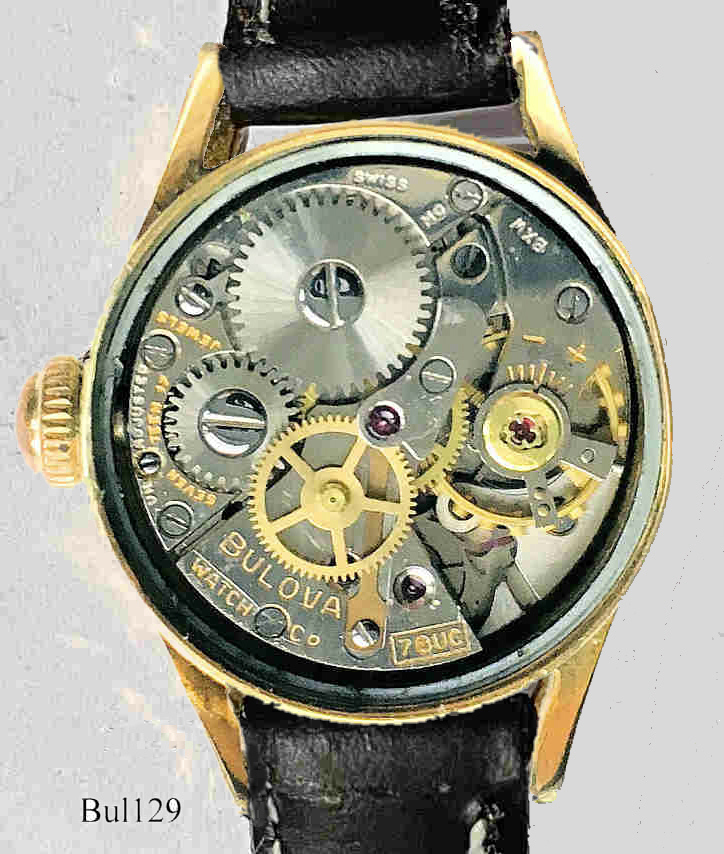 Eine Bulova Damen Handaufzugsuhr mit vergoldetem Gehäuse. Beschriftet vorn: “ Bulova, Waterproof”, hinten: “Bulova, Waterproof”, innen:” Bulova Watch Co., U.S.A.,17 Jewels,7BUC, N0”. Caliber Bulova 7BUC, Herstelldatum 1970 (N0).