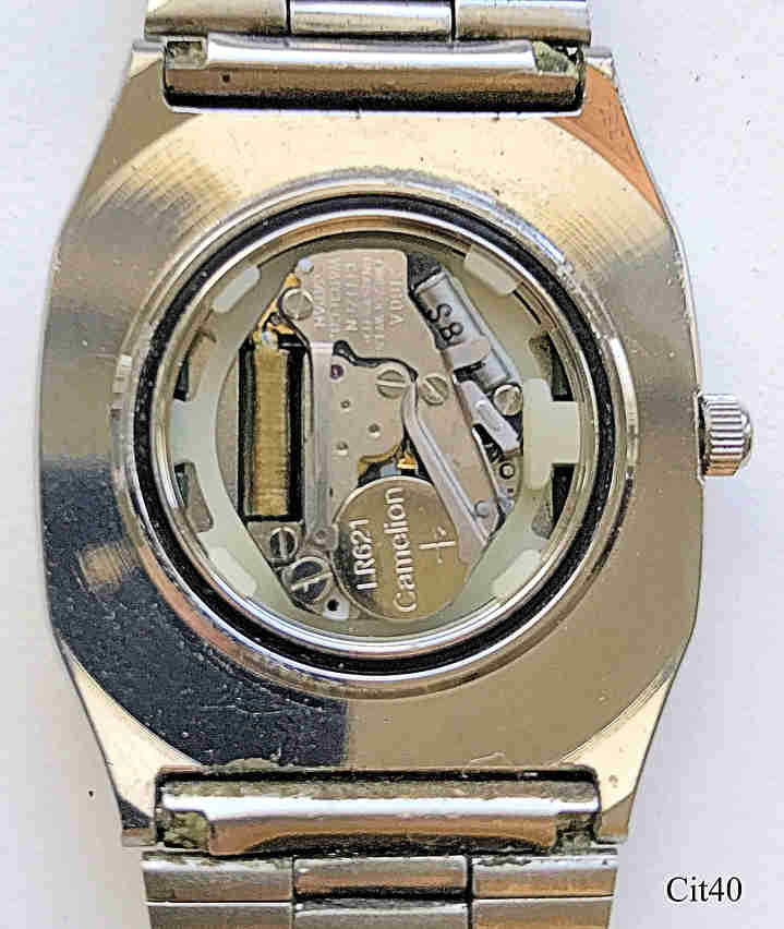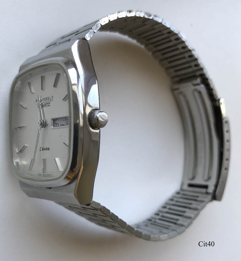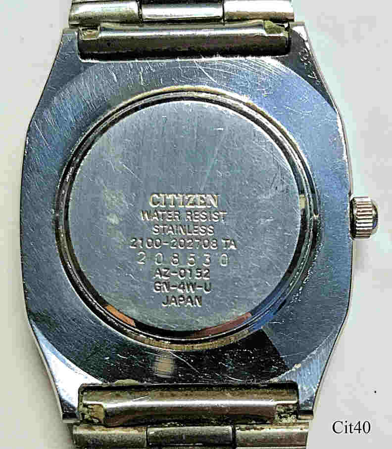 Dies ist eine Citizen Quartz Uhr, Modell Seven, Tag & Datum bei der 3. Beschriftet vorn:” Citizen, Quartz, Seven, Japan, 2100-202331-Y”, hinten:” Citizen, Water Resist, Stainless, 2100-202708 TA,208530,AZ0152, GN-4-WU, Japan”, innen: “2100A, Two 2 Jewels, Unadjusted, Citizen Watch Co., Japan”.