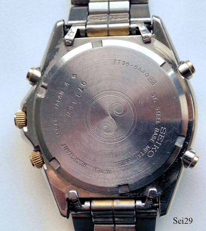 Dies ist ein elektronischer Chronograf von Seiko mit Mondphase, Kaliber 7T36A. Mondphase bei 12, Datum bei 3, Alarmzeit bei 6, Sekunden bei 9. Beschriftung vorn: ”Seiko, Chronograph, Quartz, Sports, 150, Alarm“, innen:”Japan, Seiko Time Corp., unadjusted, no Jewels, 7T36A”, hinten:”Seiko, St. Steel, Base Metal Bezel, Water Resistant 15 Bar, Japan A, 7T36-6A40, 971368” mit Stahlboden und Twotone Gliederarmband.