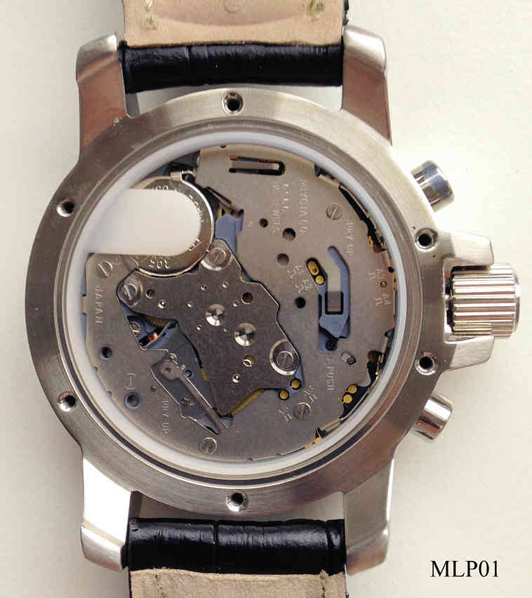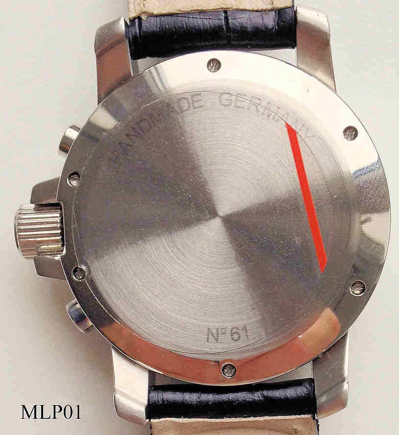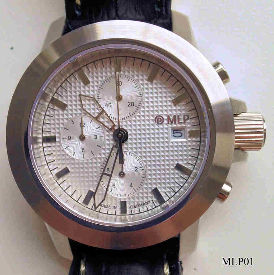 Ein 15 Jahre Jubiläums Chronograph der Firma MLP, Handfertigung aus Deutschland. Beschriftet vorn: “MLP, Made in Germany”, hinten: ”Handmade Germany, No. 61”, innen: “Miyota Co., 0S60, No Jewels, Japan” . Das Werk ist ein Miyota Kaliber 0S60. Datum bei der “3”, Sonderanfertigung für Frau Xxxxx Xxxxxx. Eine weitere MLP Jubiläumsuhr ist hier. Die Basisuhr ist eine Costro Wien.