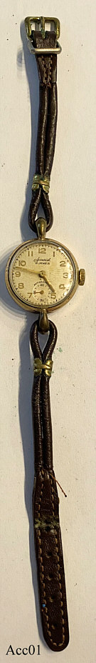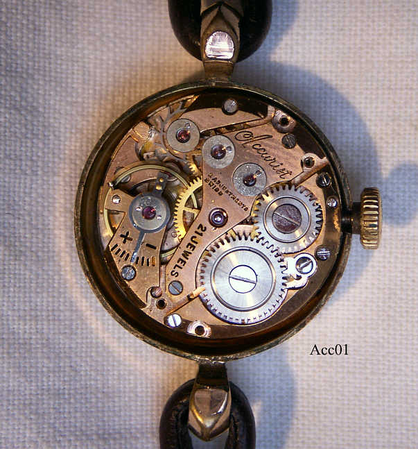 This is an Accurist ladies Handwind watch with gold case. Signed front: ”Accurist, 21 Jewels, Antimagnetic”, back: “ Accurist”, inside: “Accurist, 2 Adjustments, Swiss, 21 Jewels”. Case gold plated with fixed oars for the band.